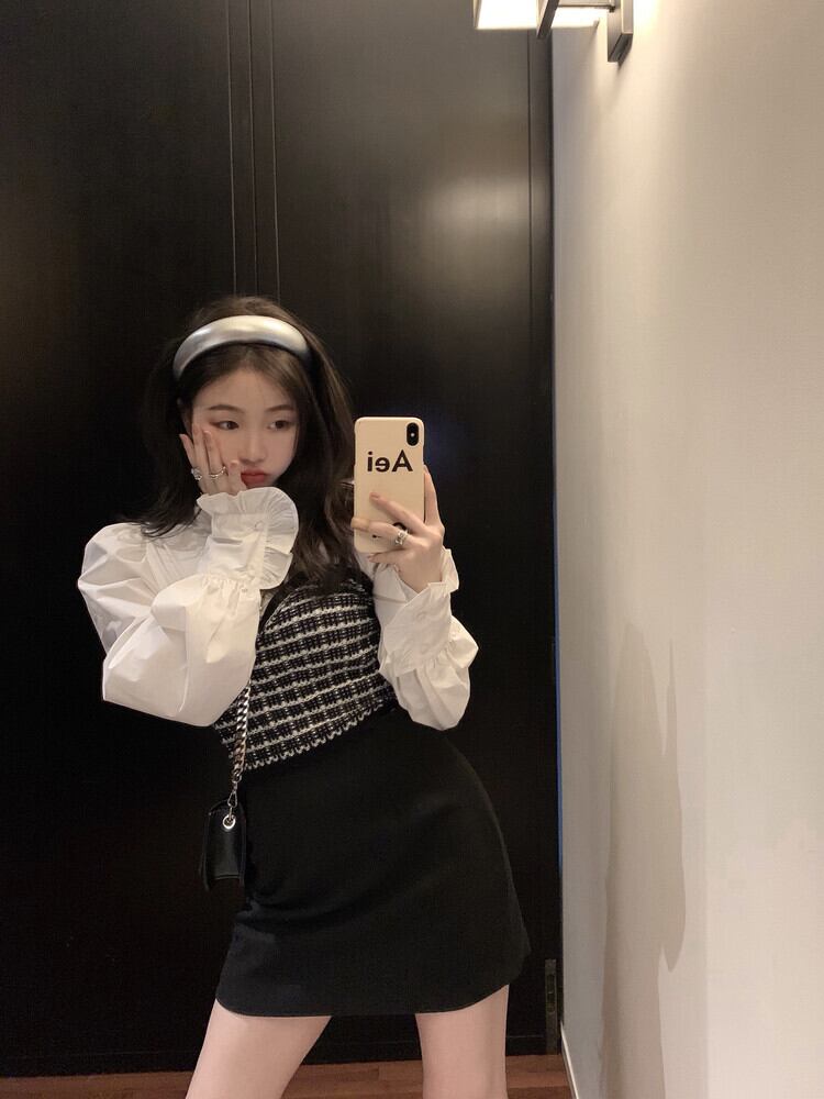 トレンディな白シャツ&ハイウエスト黒スカートのセット