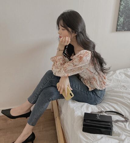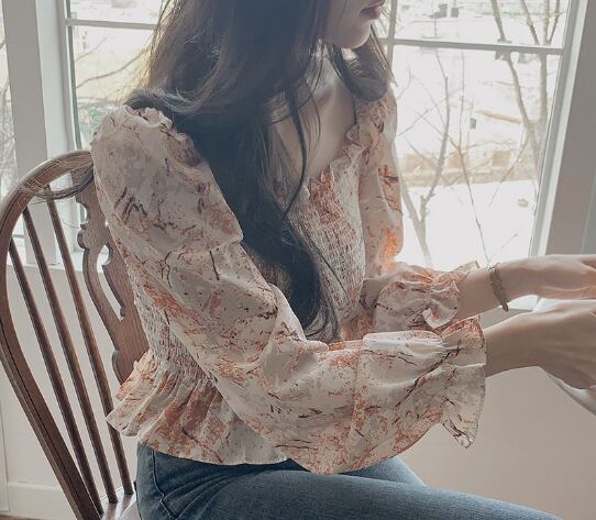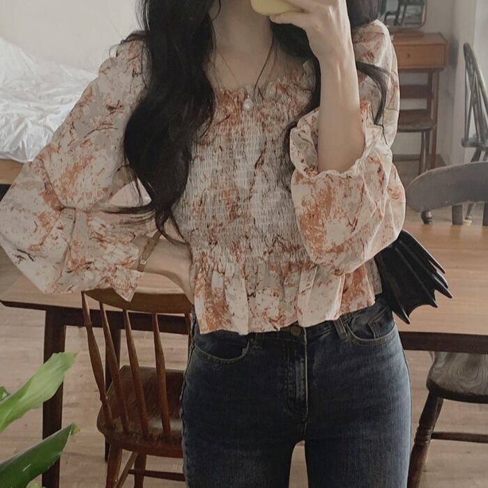 トップス ブラウス プルオーバー ショート丈 長袖 蓮の葉スリーブ スクエアネック 襟なし スリム シフォン 大人可愛い カジュアル お洒落 ラブリー キュート ガーリー とろみ感 柄 花柄 春 秋 誕生日 10代 20代 30代 女性用 レディース OL 通勤 学生 通学 デート お出かけ 女子会 お泊まり 休日 イベント リゾート 旅行 高原 ホテル レストラン ショッピング ファッション コーデ スタイル 楽ちん モテ プレゼント ギフト インスタ映え S M L XL 青 ブルー オレンジ