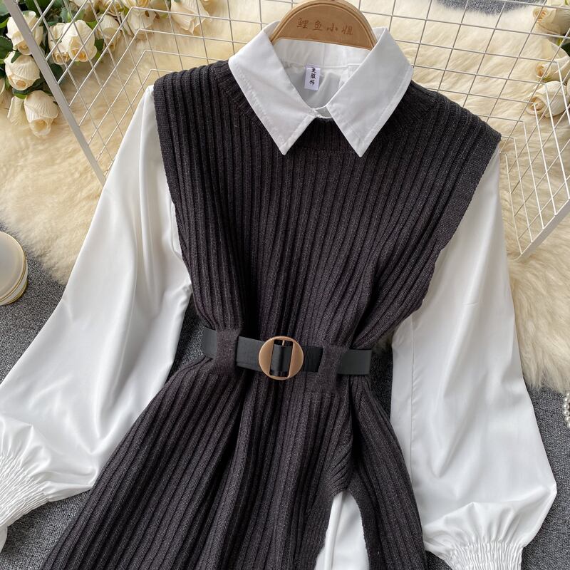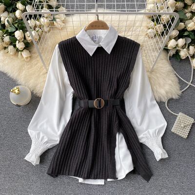 トップス シャツ ニットソー 白シャツ レギュラー丈 ノースリーブ 長袖 ラウンドネック 角襟 Aライン ベルト ニット 2点セット 大人可愛い きれいめ カジュアル お洒落 大人女子 こなれ感 キュート 無地 春 秋 誕生日 10代 20代 30代 女性用 ママ OL 通勤 学生 通学 デート お出かけ 女子会 休日 イベント 旅行 ホテル レストラン ショッピング 重ね着 オルチャン スタイル 暖かい モテ ギフト 安い インスタ映え 韓国風 ワンサイズ 黒 茶色 アプリコット ダークグレー