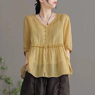 トップス ブラウス プルオーバー レギュラー丈 五分袖 レギュラー袖 Vネック 綿 麻 リネン 薄手 大人可愛い カジュアル お洒落 こなれ感 キュート ルーズ 個性的 とろみ感 無地 夏 10代 20代 30代 女性用 ママ OL 通勤 学生 通学 デート お出かけ 公園デビュー 女子会 お泊まり 休日 イベント リゾート 旅行 海 プール 高原 ホテル レストラン ショッピング 外国風 楽ちん モテ ギフト 安い インスタ映え M L XL 2XL ゆる 緑 紫 黄色 ピンク アプリコット