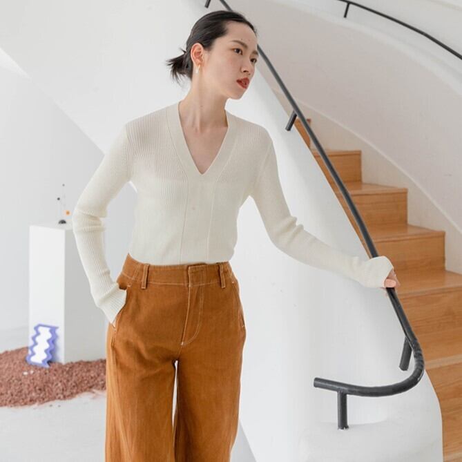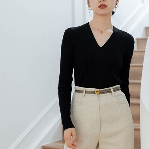 Vネックでフィット感のある長袖トップスです