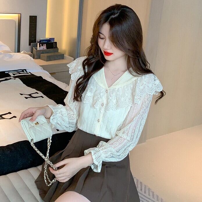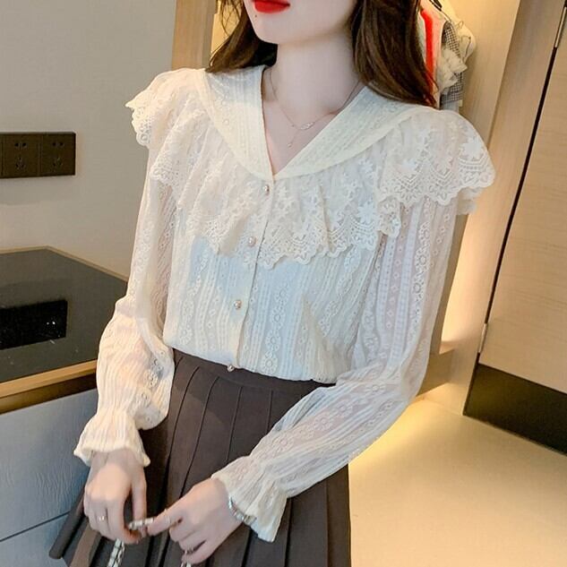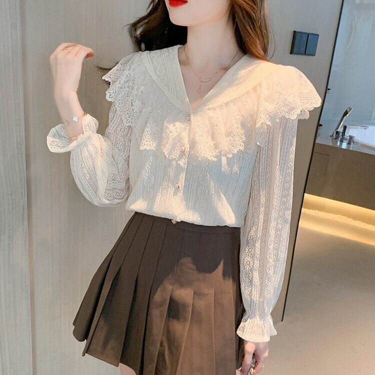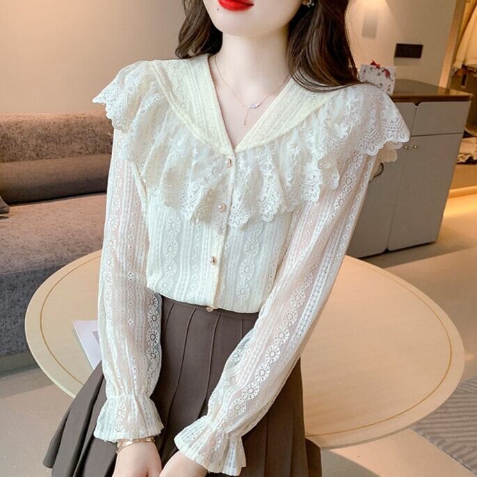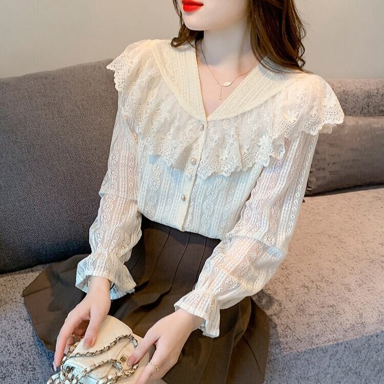 レースの大きい襟がお洒落な長袖シャツです