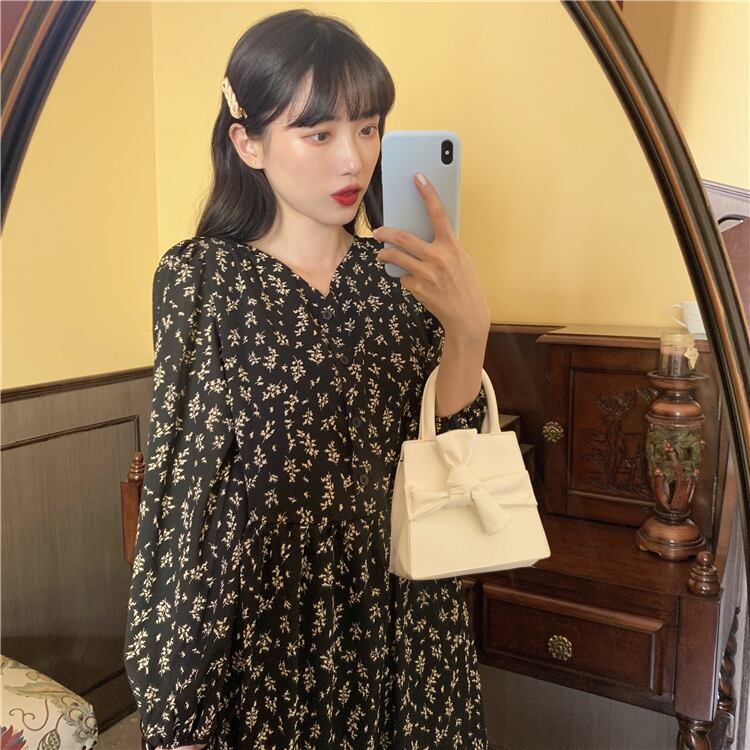 ワンピース ワンピーススカート 膝下 レギュラー丈 長袖 パフスリーブ Vネック Aライン バックリボン 大人可愛い カジュアル 上品 お洒落 大人女子 ラブリー キュート ガーリー ルーズ クール エレガント とろみ感 柄 小花柄 春 秋 誕生日 母の日 10代 20代 30代 女性用 ママ 通勤 学生 通学 デート お出かけ 女子会 お泊まり 休日 イベント リゾート 旅行 高原 ホテル ガーデン レストラン ショッピング ファッション モテ ギフト インスタ映え フレンチ フリーサイズ 黒 白