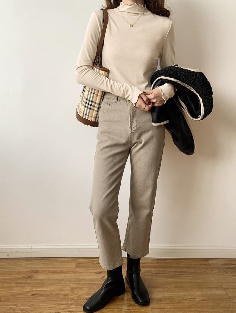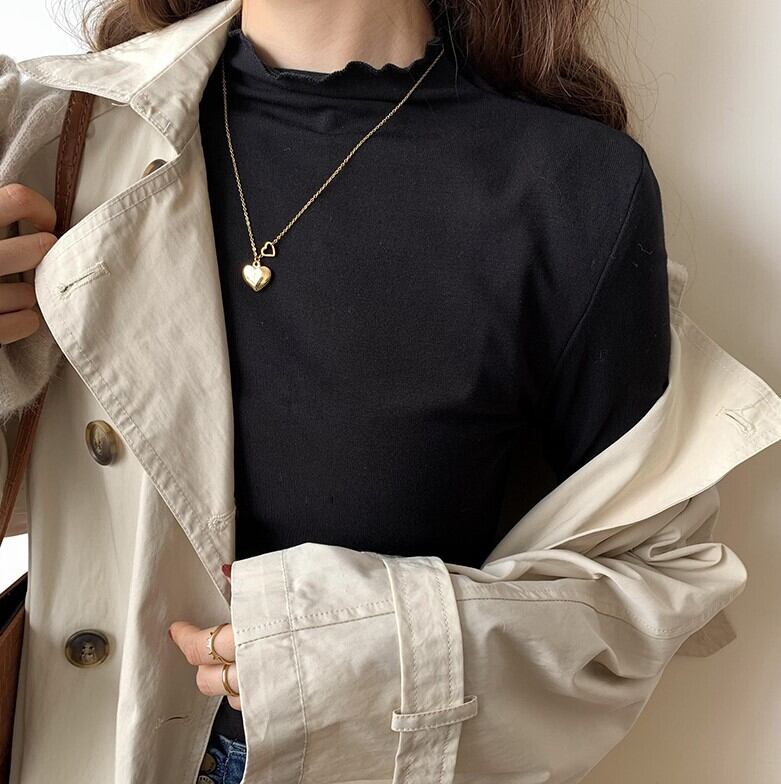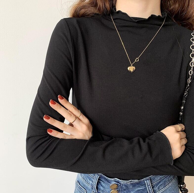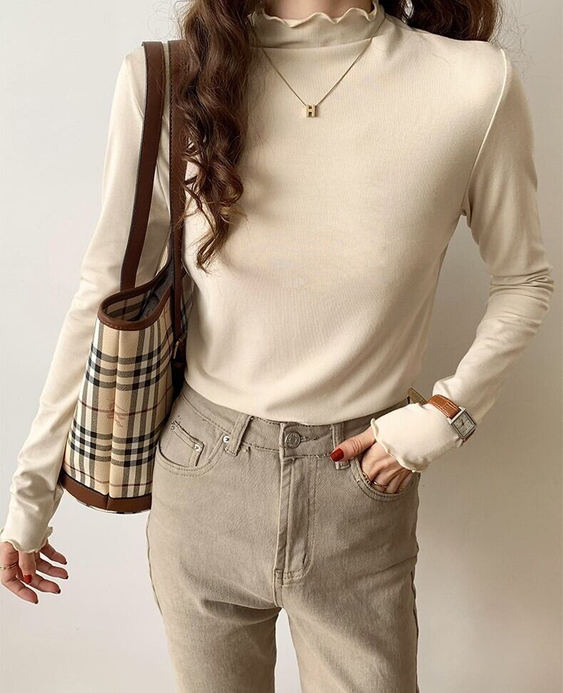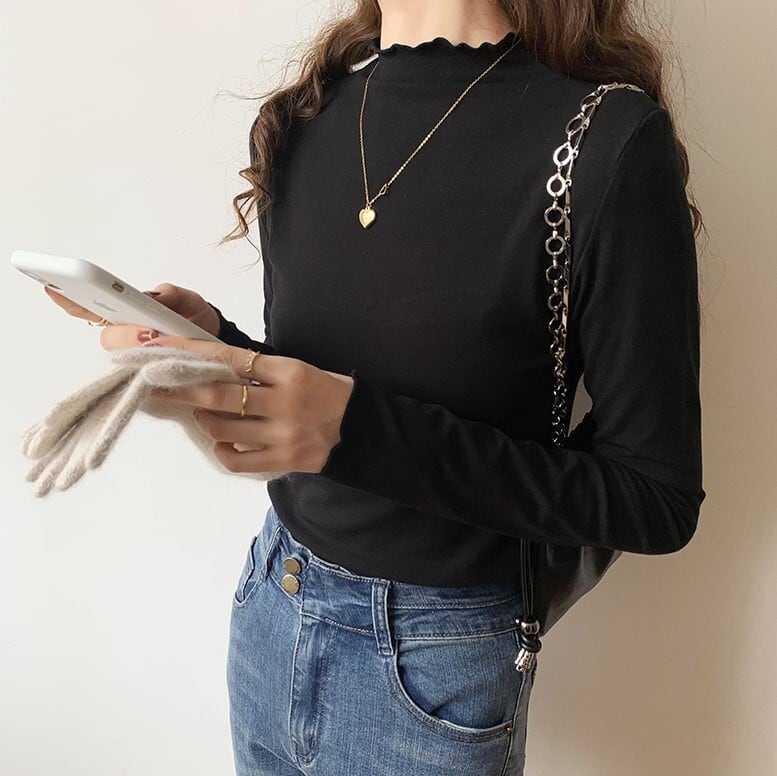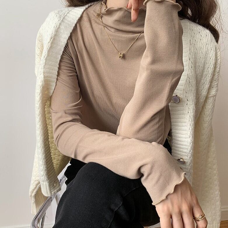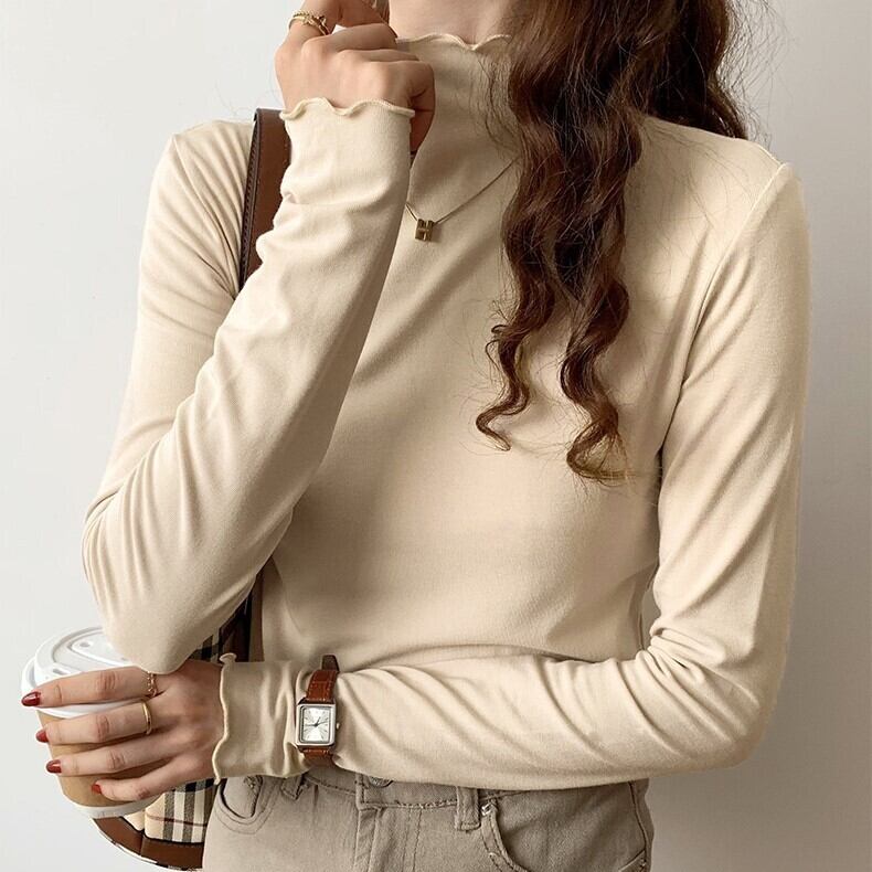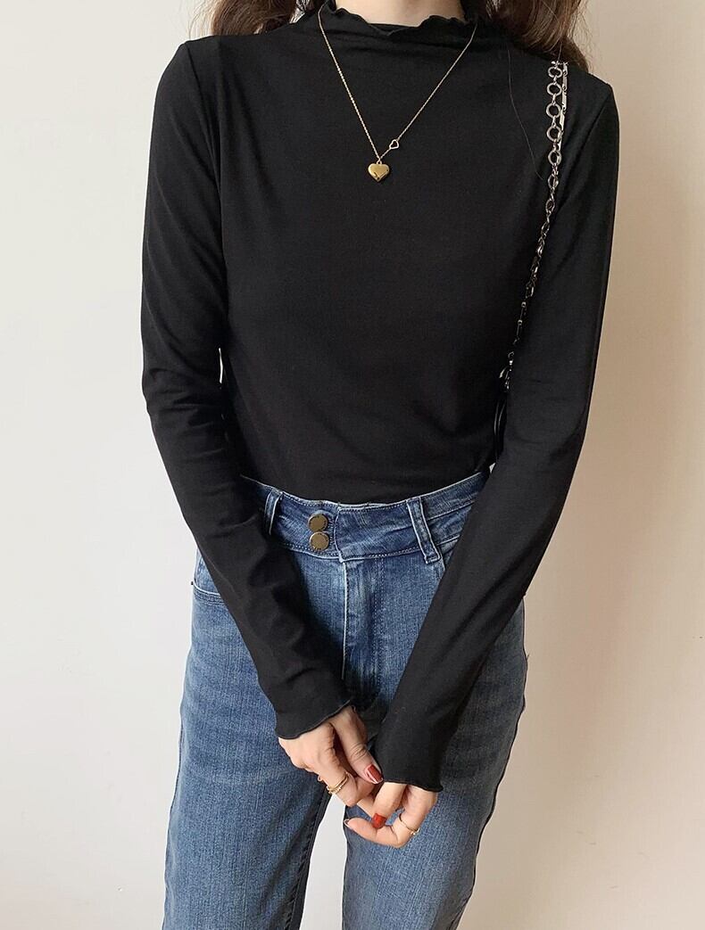 メロウヘム レタスエッジ トップス カットソー ミディアム丈 長袖 プチハイネック モックネック 細身 スリム スマート 伸縮性 ストレッチ かわいい 大人可愛い シンプル カジュアル きれいめ 上品 おしゃれ お洒落 無地 春 秋 レディース 女性用 ママ 女の子 OL 通勤 学生 通学 デート お出かけ 女子会 普段使い 重ね着 着回し レイヤード ジャケットイン 韓国風 オルチャン ファッション コーデ スタイル S M L XL すっきり 白 ホワイト 黒 ブラック ベージュ カーキ カラバリ