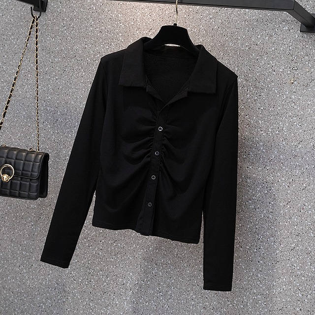 フロントギャザー 胸元ふんわり トップス ブラウス ミディアム丈 長袖 襟付き フロントボタン 立体感 前開き カットソー生地 シンプル カジュアル きれいめ 上品 おしゃれ お洒落 セクシー エレガント 女っぽ 無地 春 秋 レディース 女性用 ママ 女の子 OL 通勤 学生 通学 デート お出かけ 女子会 普段使い 着回し 重ね着 ジャケットイン 韓国風 オルチャン ファッション コーデ スタイルアップ L XL 2XL 3XL 4XL 大きいサイズ 黒 ブラック 緑 アーミーグリーン カラバリ