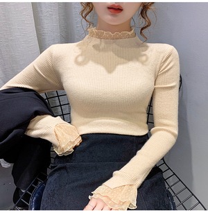 袖口とネック部分をドット柄の透かしレース生地で切り替えた重ね着風デザインのドッキングリブニットソー。