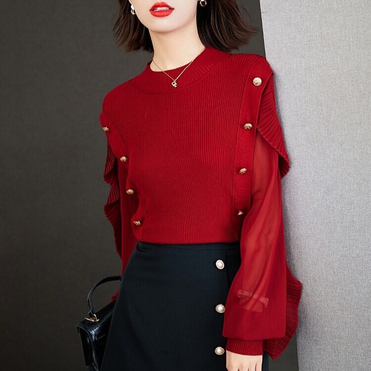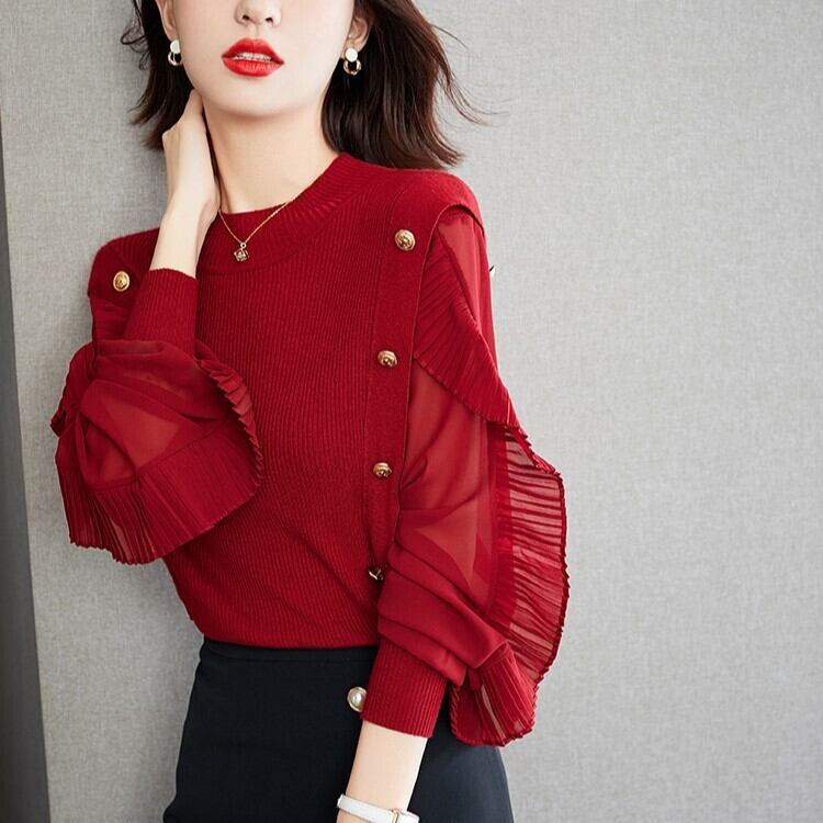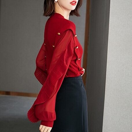 トップス カットソー 袖あり 長袖 ボリューム袖 ラウンドネック ストレート Iライン 切り替えデザイン ドッキング プリーツ シフォン フリル 透け感 薄手 異素材MIX かわいい 大人可愛い きれいめ 大人 上品 おしゃれ お洒落 大人可愛い 大人女子 こなれ感 ラブリー キュート ガーリー 個性的 エレガント 存在感 とろみ感 抜け感 20代 30代 40代 レディース 女性用 OL 通勤 デート お出かけ 女子会 休日 旅行 ホテル 着回し 普段使い モテ S M L XL 2XL 赤 レッド