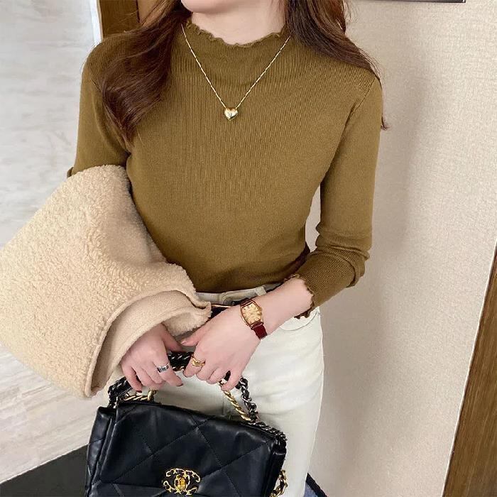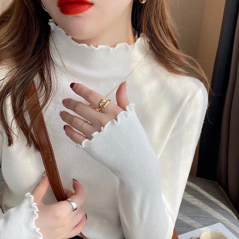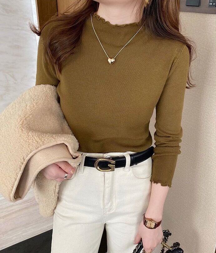 メロウヘム レタスエッジ リブニット トップス ニットソー ミディアム丈 長袖 プチハイネック モックネック 細身 スリム スマート 伸縮性 ストレッチ かわいい 大人可愛い シンプル カジュアル きれいめ 上品 おしゃれ 無地 春 秋 冬 レディース ママ 女の子 OL 通勤 学生 通学 デート お出かけ 女子会 普段使い 重ね着 着回し レイヤード ジャケットイン 韓国風 オルチャン スタイル S M L XL すっきり ホワイト ブラック グリーン オレンジ ベージュ カーキ キャラメル カラバリ