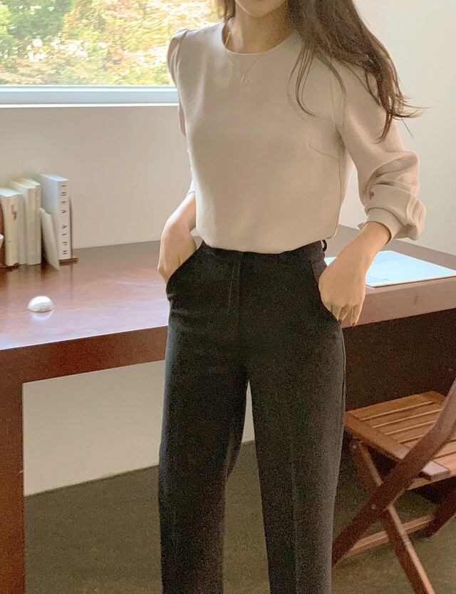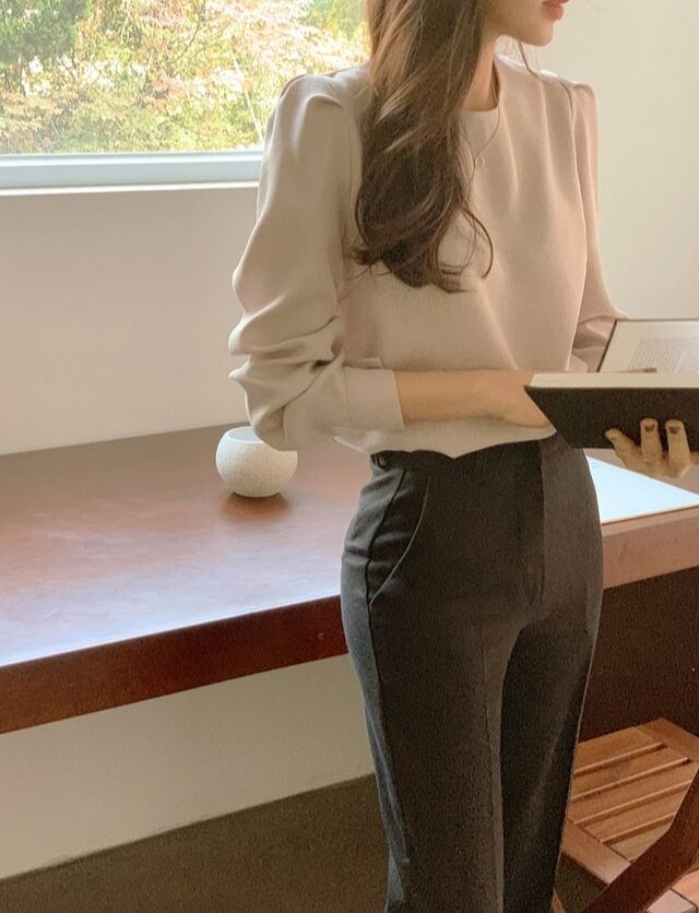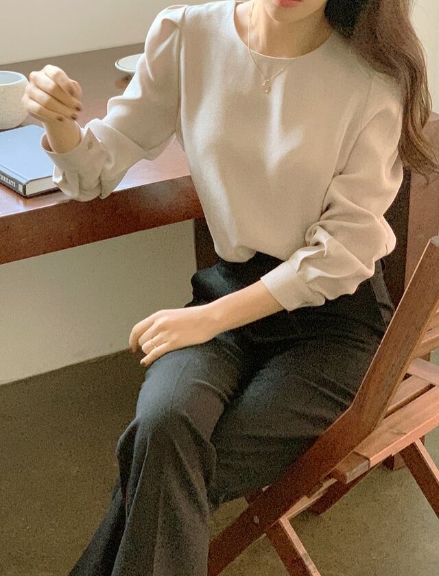 肩山部分とカフス上部分にタックを寄せたパフスリーブがポイントの大人可愛いブラウス。