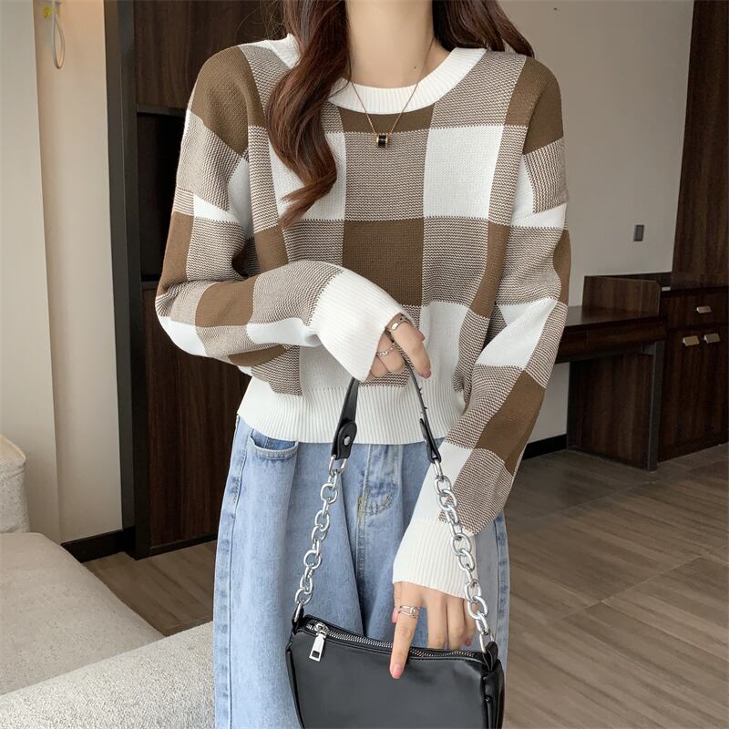 大きめチェック柄 クロップド トップス セーター ショート丈 長袖 ドロップショルダー 襟なし ラウンドネック ニット 伸縮性 かわいい 大人可愛い シンプル カジュアル きれいめ おしゃれ お洒落 レトロ 大人女子 こなれ感 キュート 存在感 インパクト 格子柄 春 秋 レディース 女性用 ママ 女の子 学生 通学 お出かけ 女子会 普段使い 重ね着 韓国風 オルチャン ファッション コーデ スタイルアップ 脚長 フリーサイズ ゆったり サイズ 黒 ブラック 青 ブルー 茶色 ブラウン カラバリ