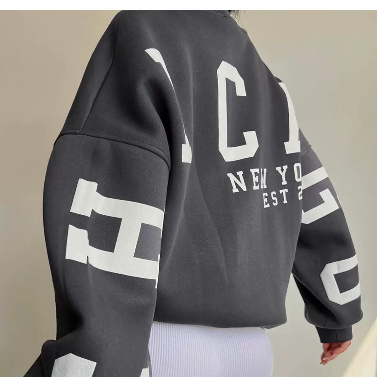 無地にアルファベットを大きくプリントし、肩から袖までボリューム感のあるデザインに仕上げられています。