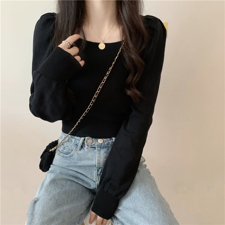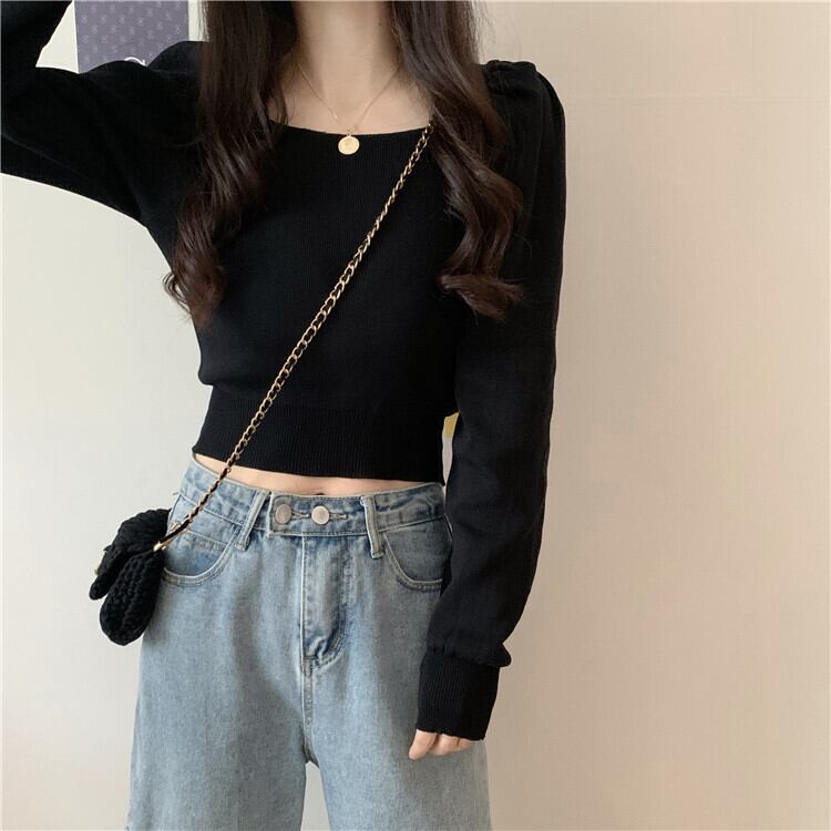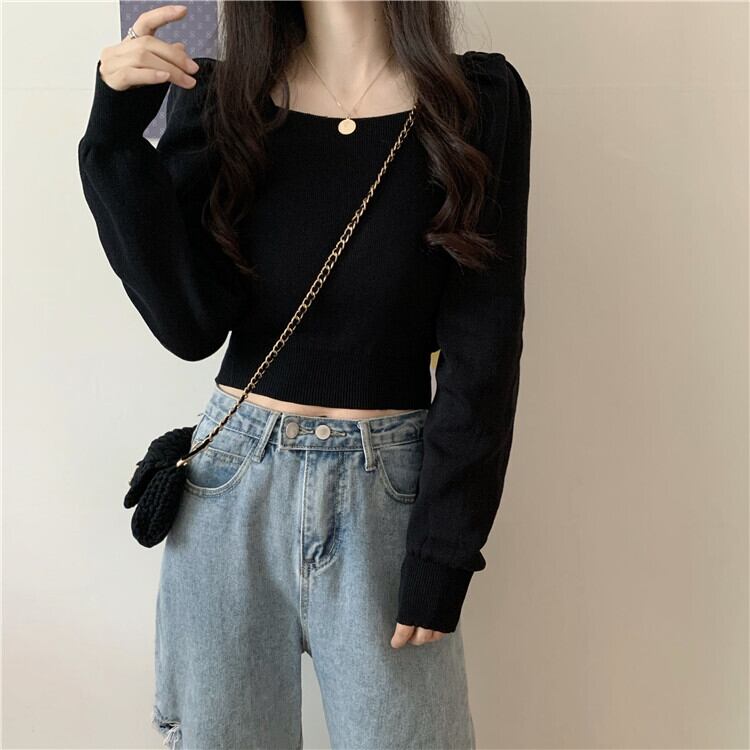 おへそ見せ お腹見せ クロップド トップス セーター ショート丈 長袖 ラグランスリーブ 襟なし スクエアネック ニット 伸縮性 かわいい 大人可愛い シンプル カジュアル きれいめ おしゃれ お洒落 セクシー こなれ感 シック 女っぽ 色っぽい 肌見せ セレカジ 無地 春 秋 冬 レディース 女性用 ママ 女の子 学生 通学 デート お出かけ 女子会 普段使い 重ね着 着回し 韓国風 オルチャン ファッション コーデ スタイルアップ 脚長 合わせやすい 万能 フリーサイズ 黒 ブラック モノトーン