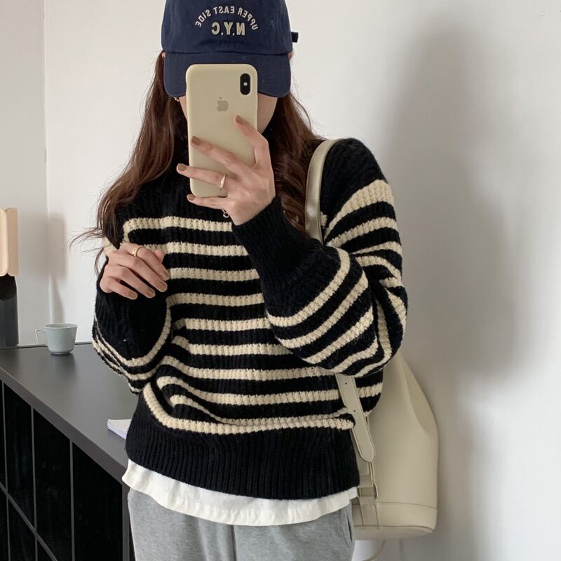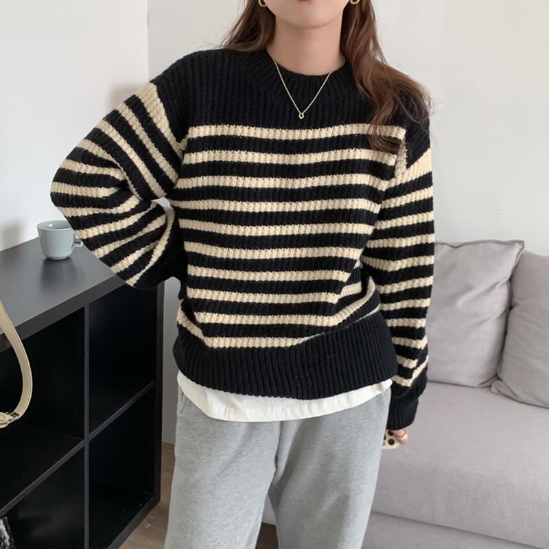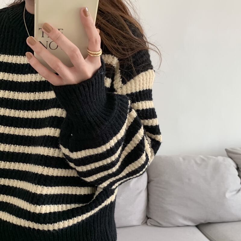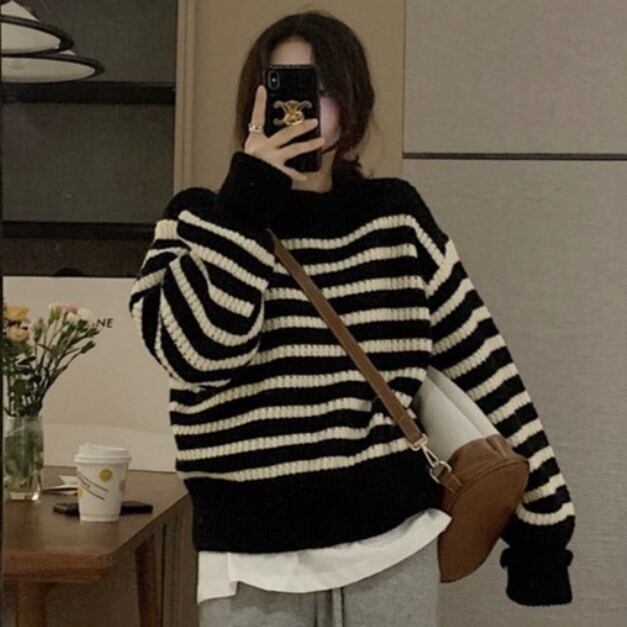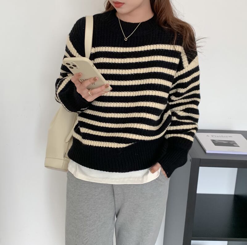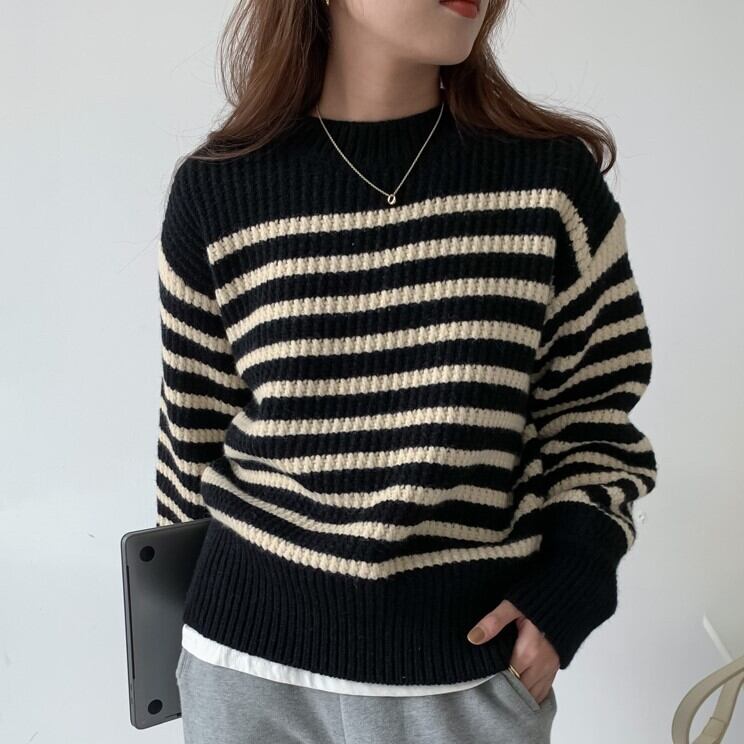 オーバーサイズ ローゲージ トップス セーター ミディアム丈 長袖 ドロップショルダー 襟なし クルーネック ニット 伸縮性 厚手 ざっくり編み かわいい 大人可愛い シンプル カジュアル おしゃれ お洒落 こなれ感 ボーイッシュ マリン調 ボーダー柄 シマ 秋 冬 レディース 女性用 ママ 女の子 学生 通学 デート お出かけ 公園デビュー 普段使い 重ね着 着回し 韓国風 オルチャン ファッション コーデ スタイル 体系カバー 定番 フリーサイズ 大きめ ゆったり サイズ 黒 ブラック モノトーン