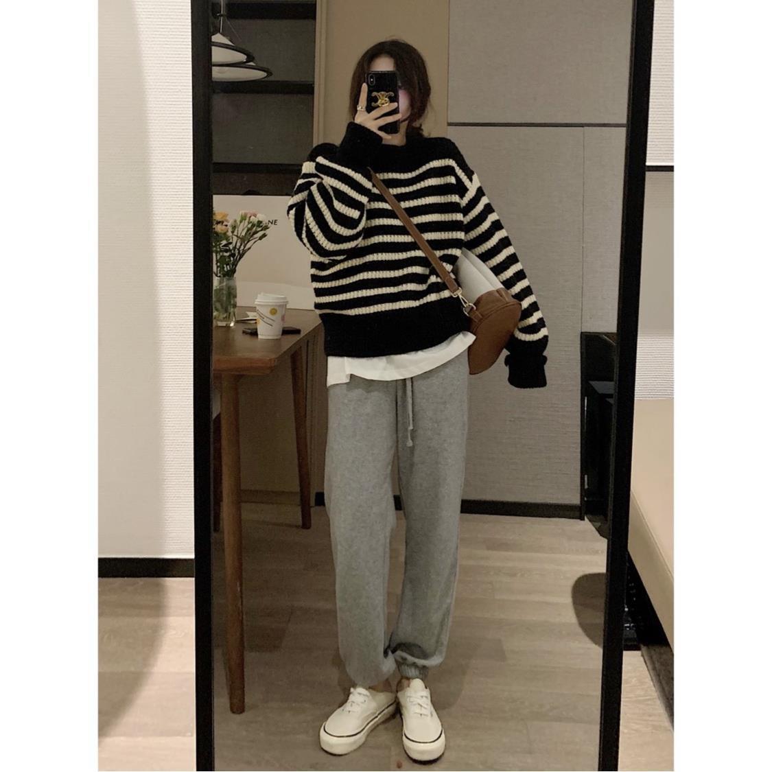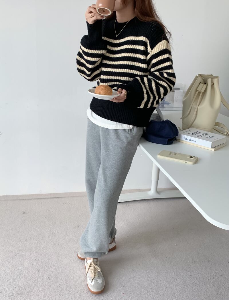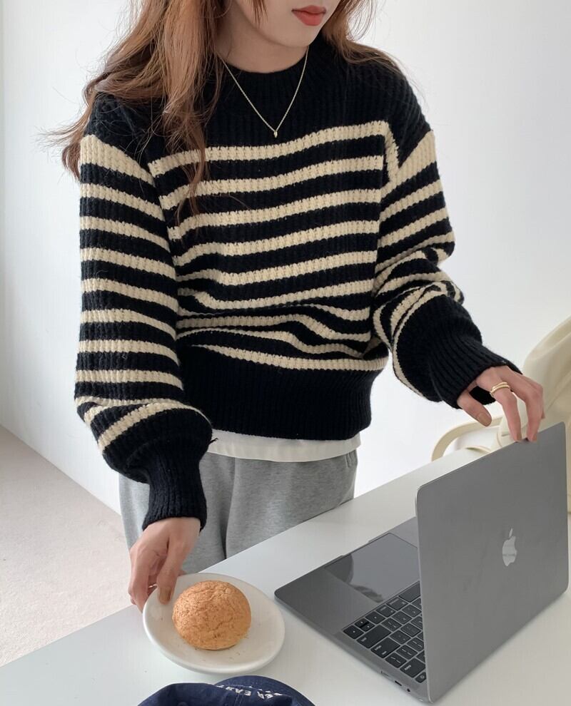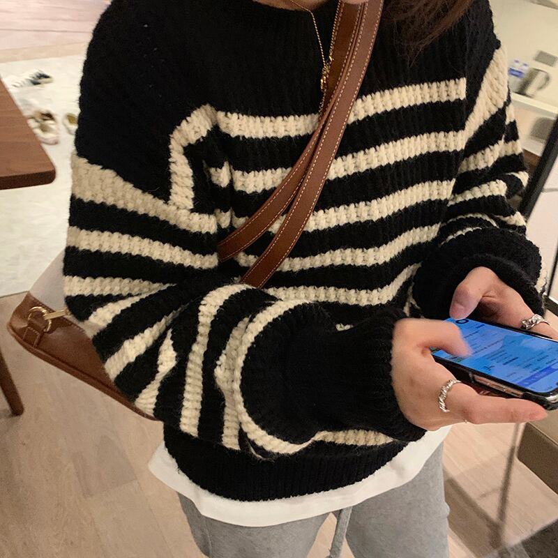 オーバーサイズ ローゲージ トップス セーター ミディアム丈 長袖 ドロップショルダー 襟なし クルーネック ニット 伸縮性 厚手 ざっくり編み かわいい 大人可愛い シンプル カジュアル おしゃれ お洒落 こなれ感 ボーイッシュ マリン調 ボーダー柄 シマ 秋 冬 レディース 女性用 ママ 女の子 学生 通学 デート お出かけ 公園デビュー 普段使い 重ね着 着回し 韓国風 オルチャン ファッション コーデ スタイル 体系カバー 定番 フリーサイズ 大きめ ゆったり サイズ 黒 ブラック モノトーン