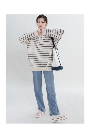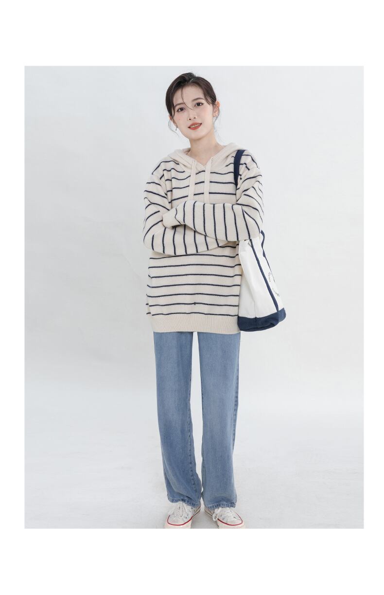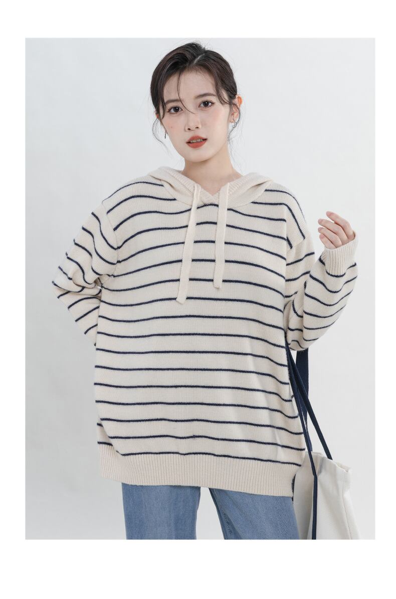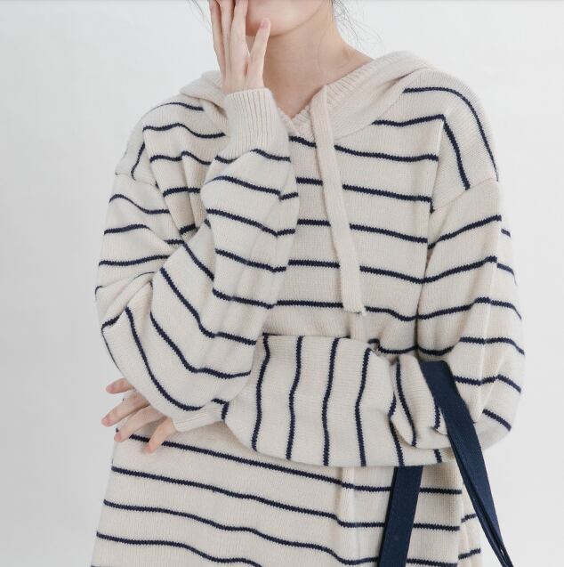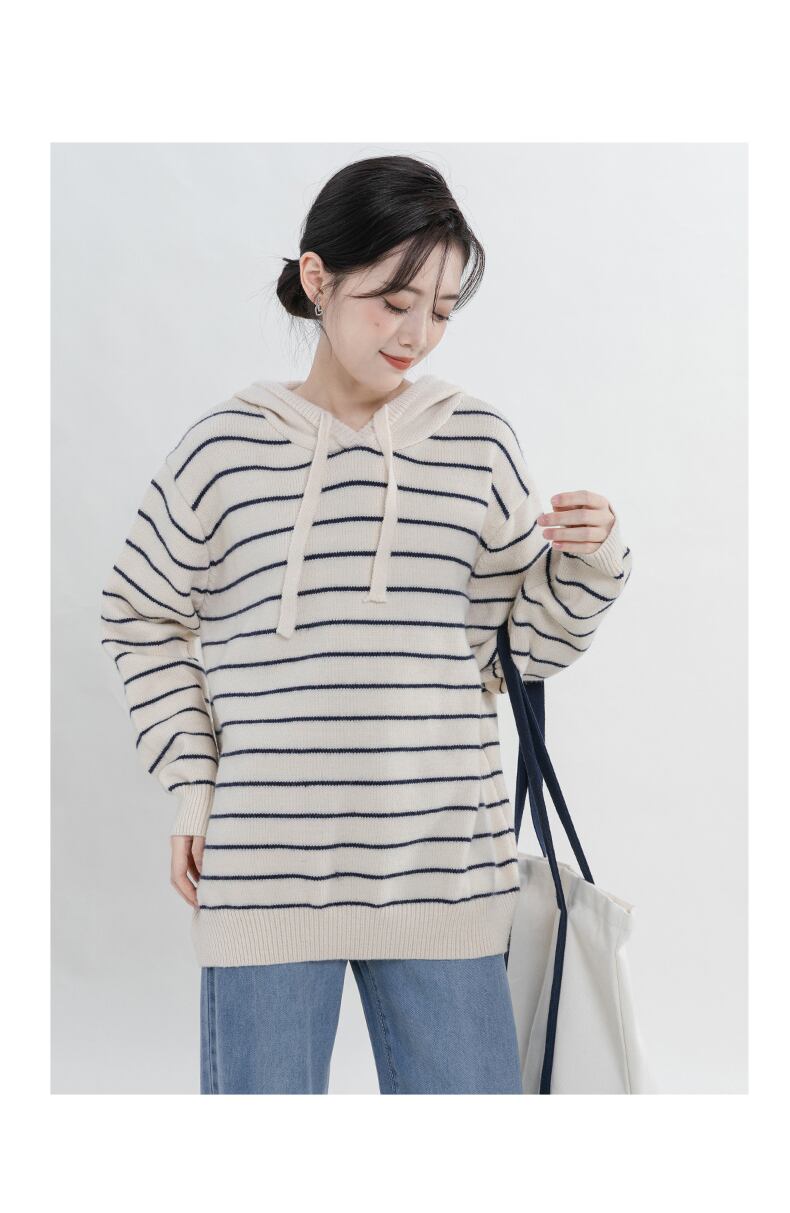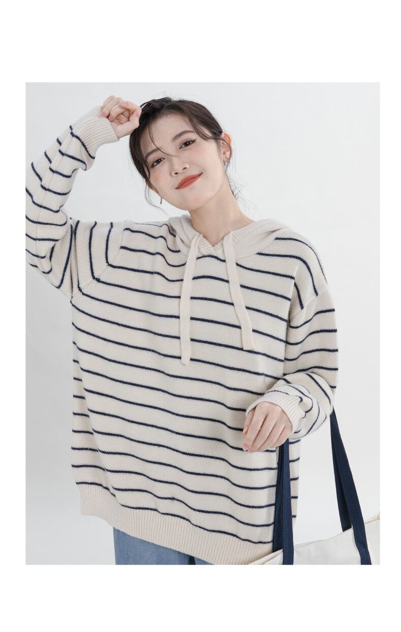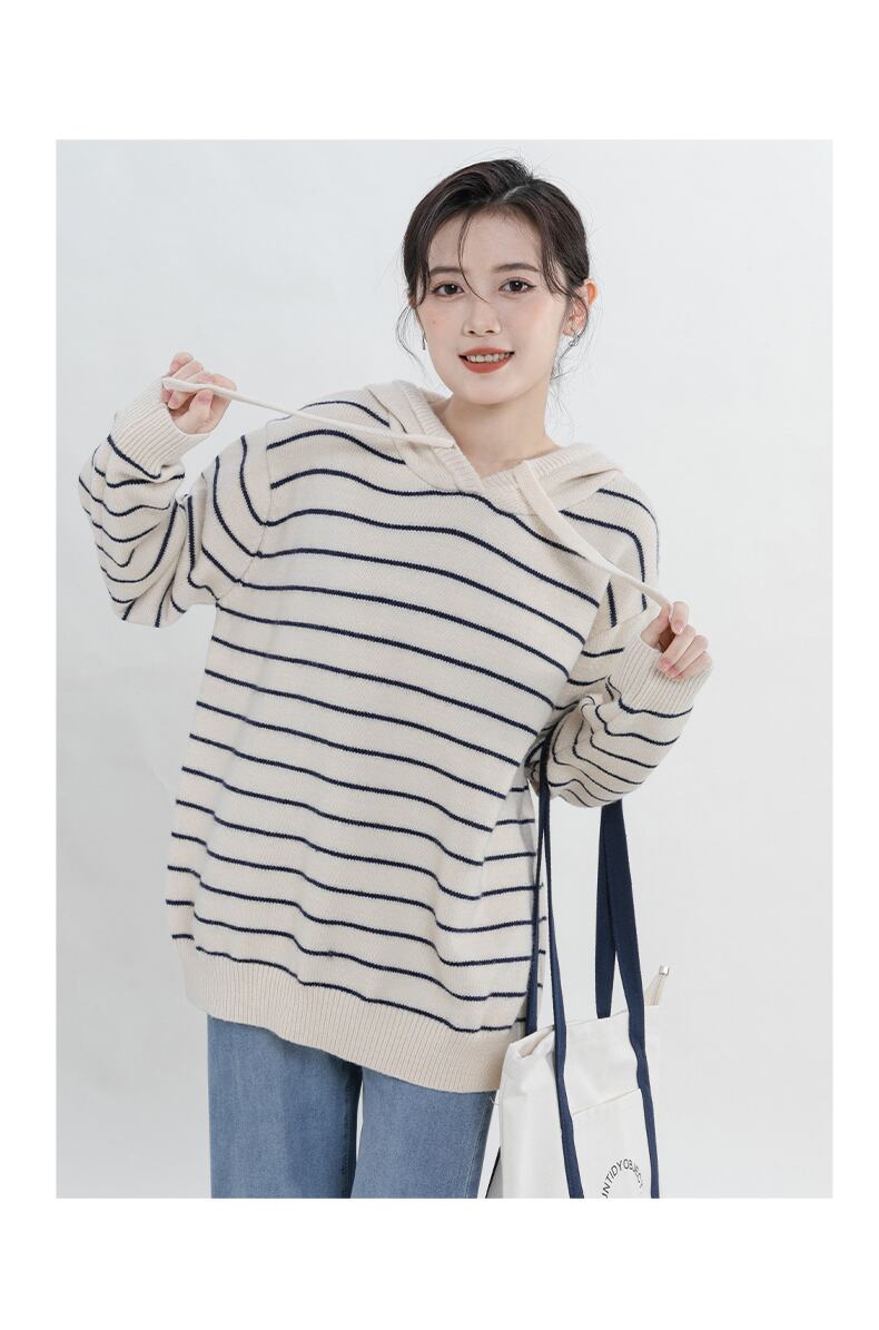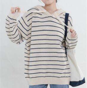 ストライプのフード付きニットセーター