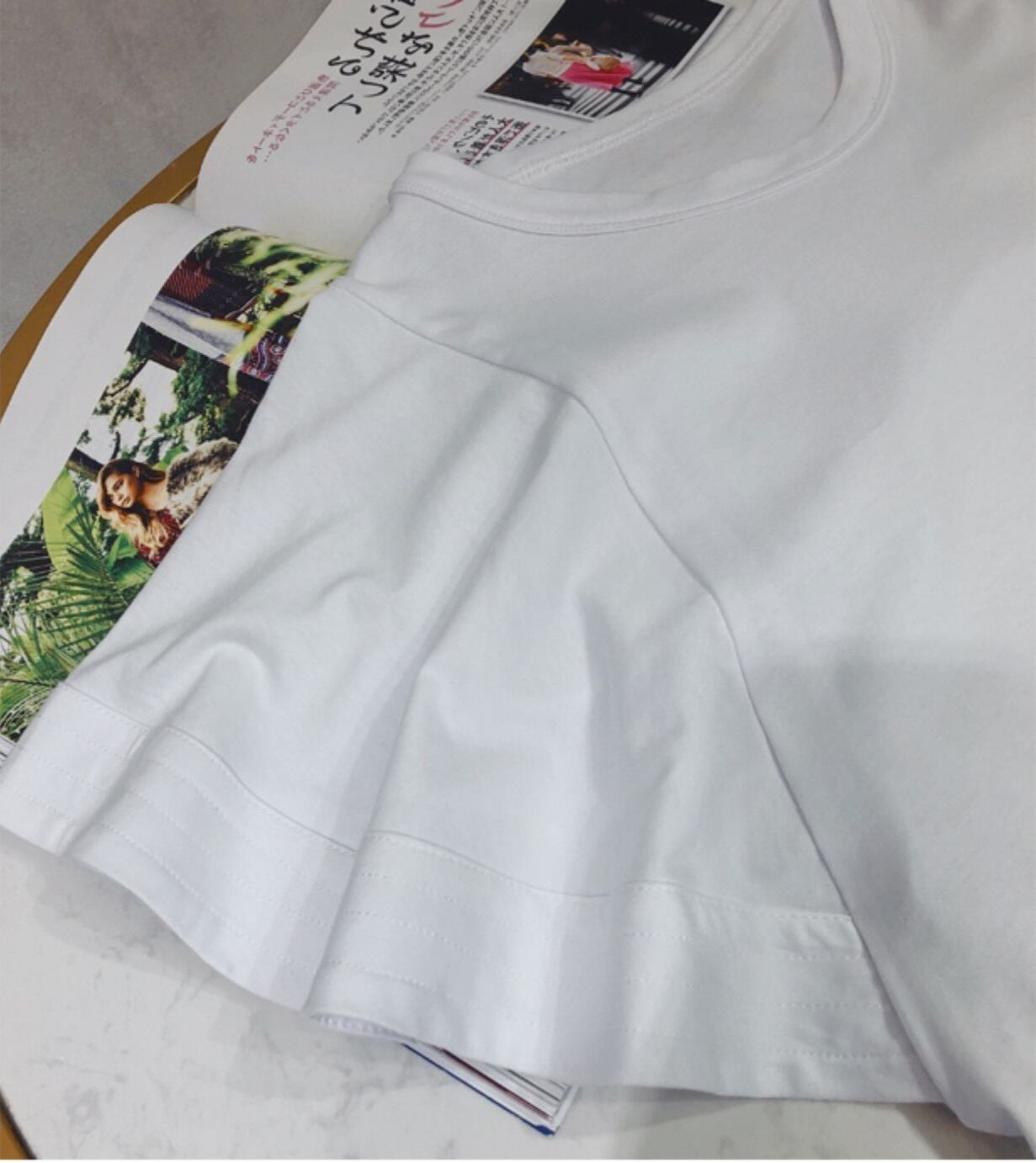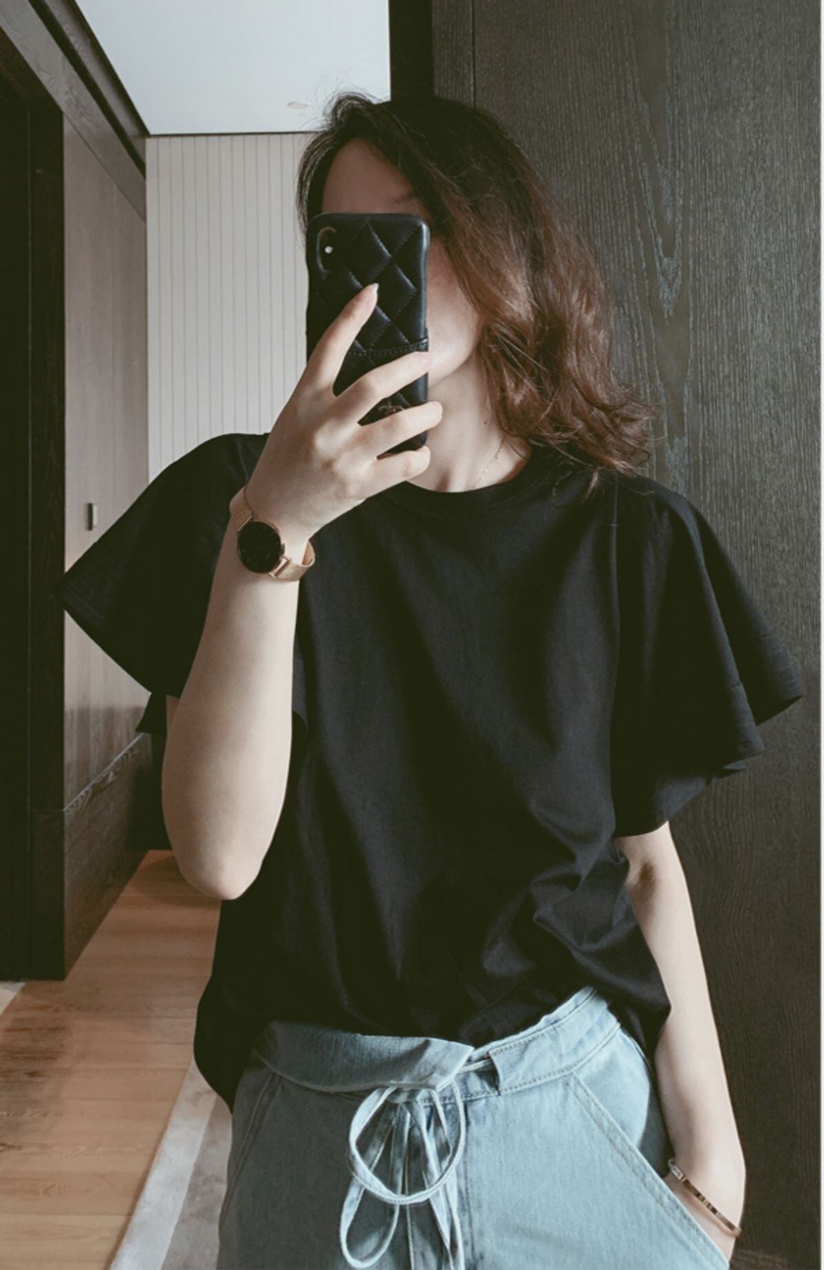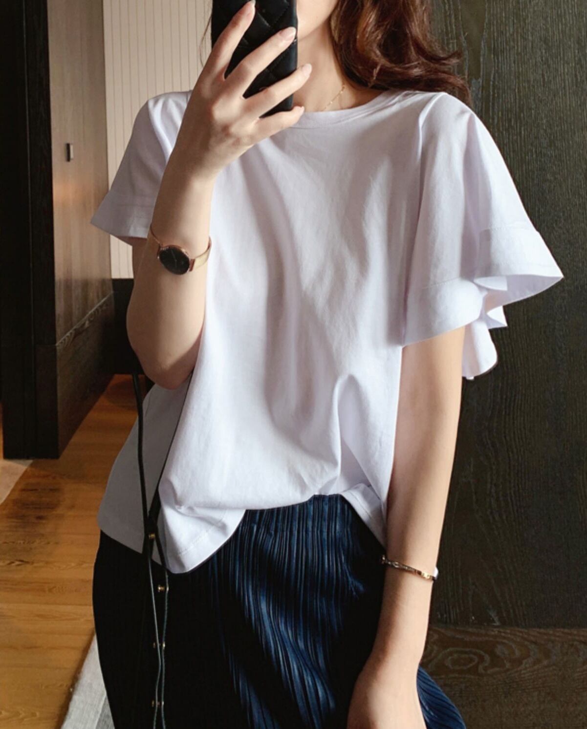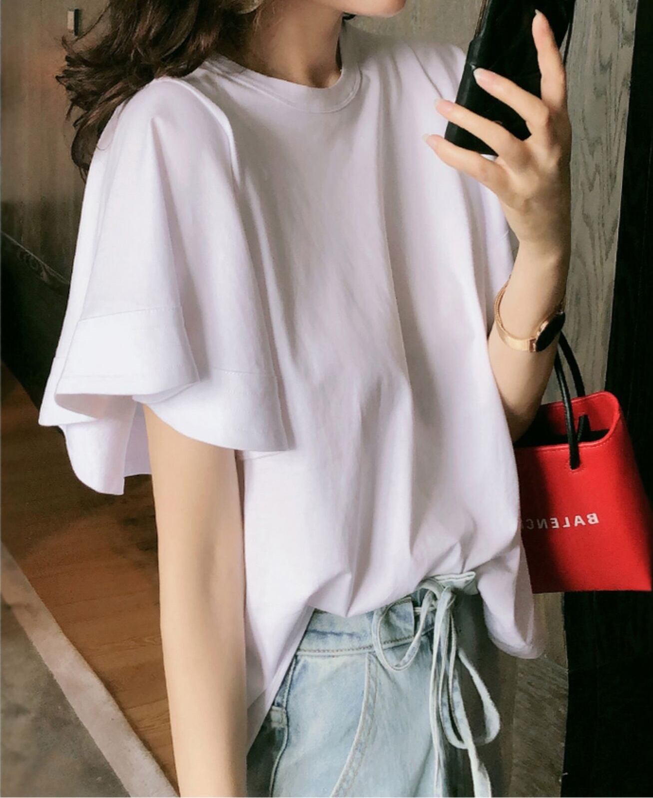 シンプルながらフリル袖が女性らしい半袖Tシャツ。