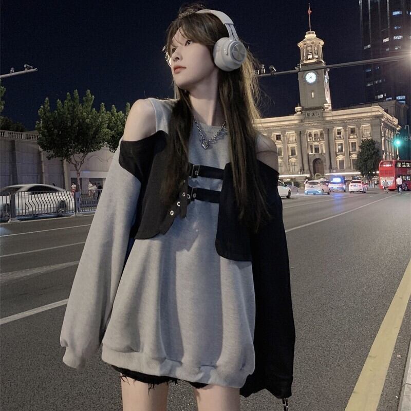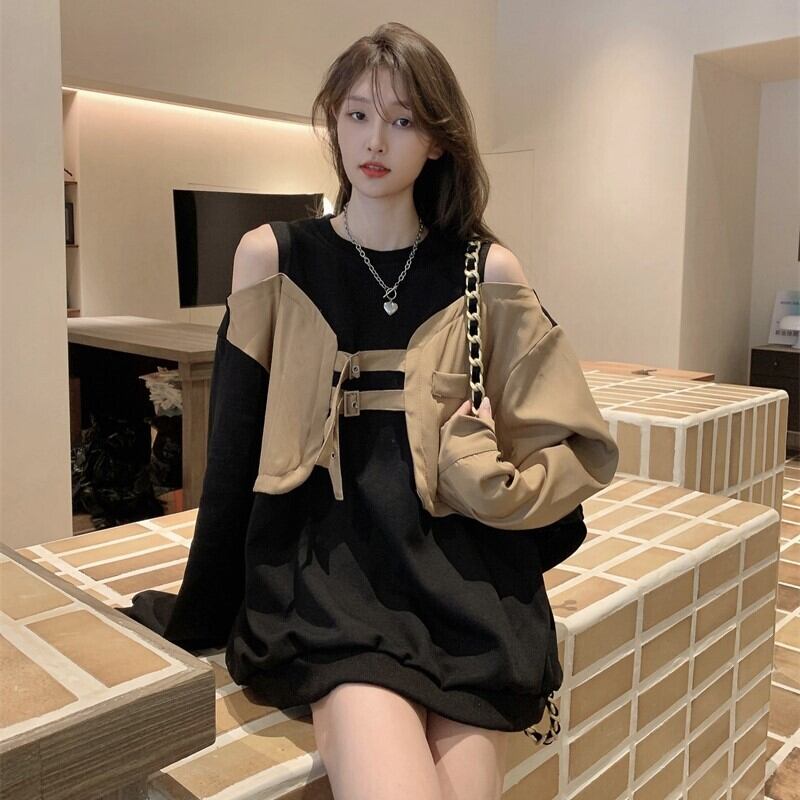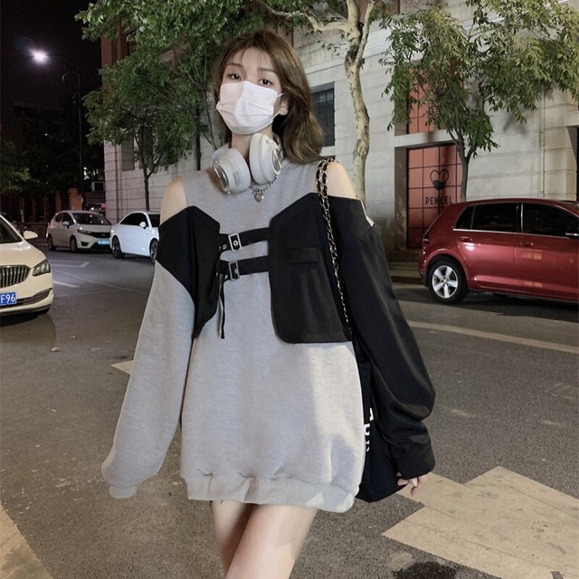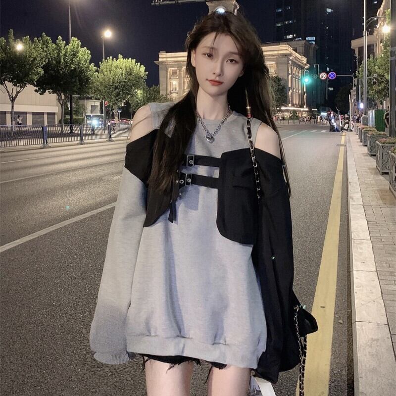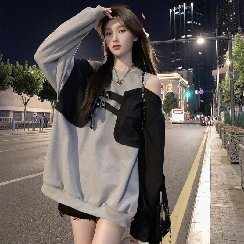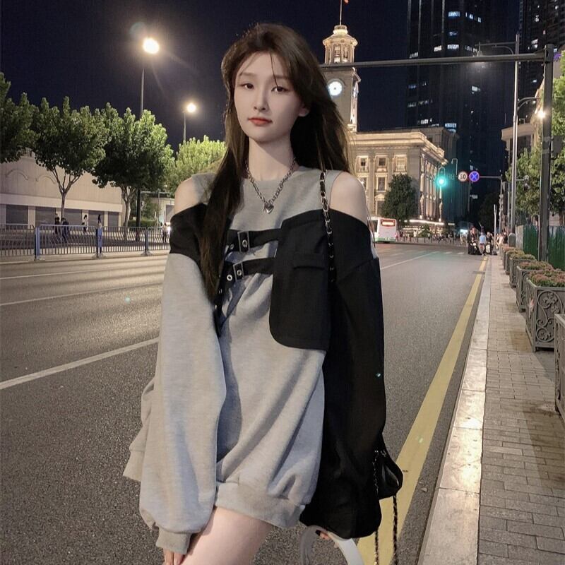トップス カットソー 長袖 ラウンドネック オフショルダー Iライン 切り替えデザイン ドッキング かわいい 大人可愛い カジュアル 大人 おしゃれ お洒落 かっこいい エキゾチック 大人可愛い 大人女子 こなれ感 ラフ マニッシュ キュート 個性的 クール モード系 存在感 抜け感 無地 10代 20代 30代 レディース 女性用 学生 デート お出かけ 女子会 休日 イベント 旅行 着回し 普段使い スタイル 楽ちん モテ 体系カバー M L XL ゆったり ゆる 黒 ブラック 灰色 グレー