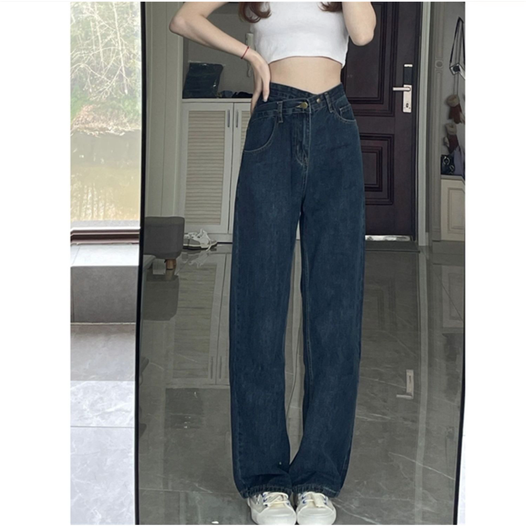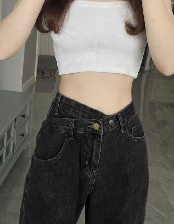 ウエストのクロスされたデザインでお腹周りの体型をカバーできる、ハイウエストのキレイめデニム。緩めの作りでありながら細身ストレートに見え、足長効果も期待できます。Tシャツやカットソーと合わせてカジュアルな着こなしに、持っていると嬉しいアイテム。