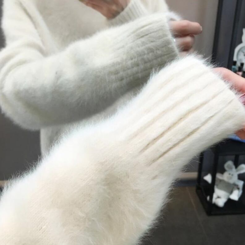 ふわふわのニットがかわいいスタイルを仕上げてくれます