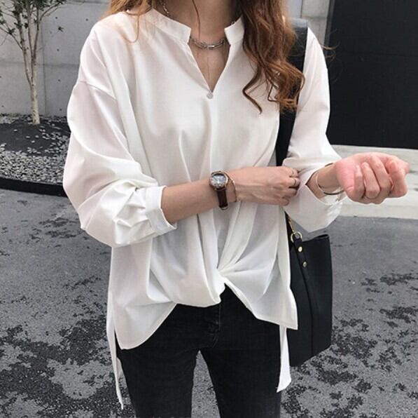 フロント裾ねじり アンバランスヘム スキッパー トップス ブラウス ミディアム丈 チュニック丈 長袖 パフスリーブ ボリューム袖 袖口タック Vネック シンプル カジュアル きれいめ 上品 おしゃれ 大人っぽい かっこいい こなれ感 とろみ感 無地 春 秋 レディース ママ 女の子 OL 通勤 学生 通学 デート お出かけ 女子会 普段使い 着回し 韓国風 オルチャン ファッション コーデ 体系カバー M L XL 2XL 3XL 4XL 大きいサイズ ゆったり ホワイト ブルー グリーン カラバリ