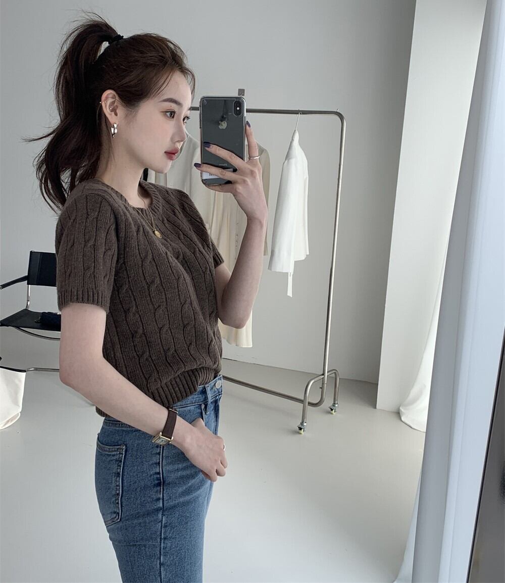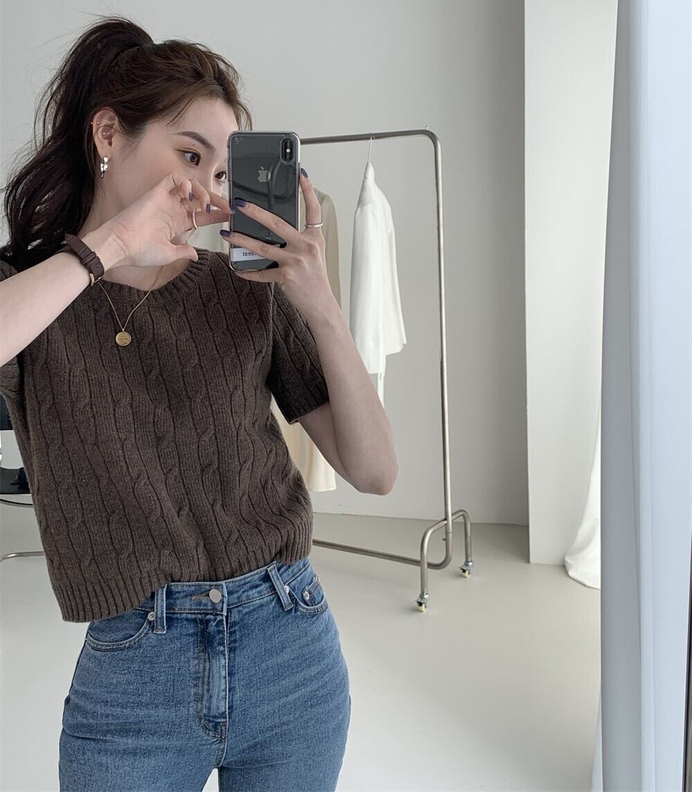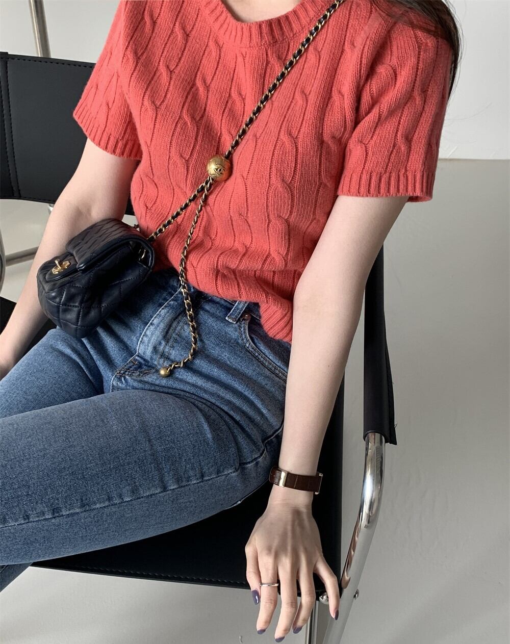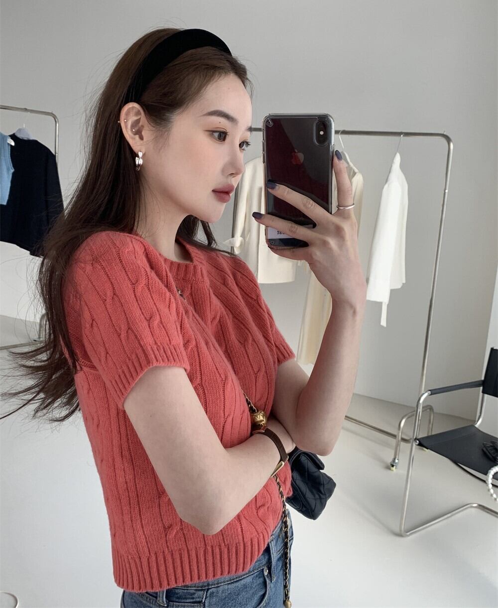 ケーブル編み クロップド トップス セーター サマーニット ショート丈 袖あり 半袖 襟なし クルーネック ニット 伸縮性 かわいい 大人可愛い シンプル カジュアル きれいめ おしゃれ お洒落 上品 大人女子 こなれ感 縄模様 春 夏 レディース 女性用 ママ 女の子 OL 通勤 学生 通学 デート お出かけ 女子会 普段使い 着回し 合わせやすい 韓国風 オルチャン ファッション コーデ スタイル 脚長見え フリーサイズ 黒 ブラック 茶色 ブラウン オレンジピンク クリームイエロー カラバリ
