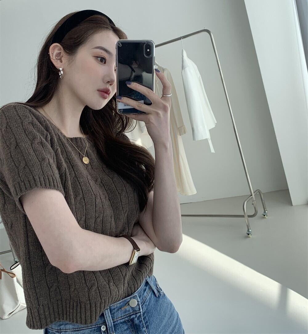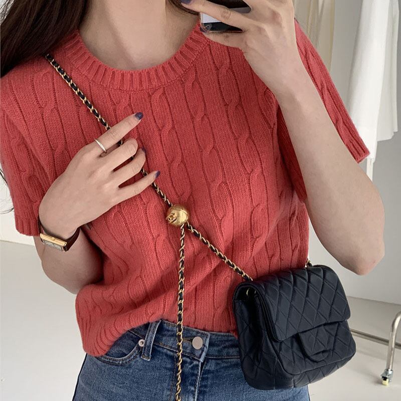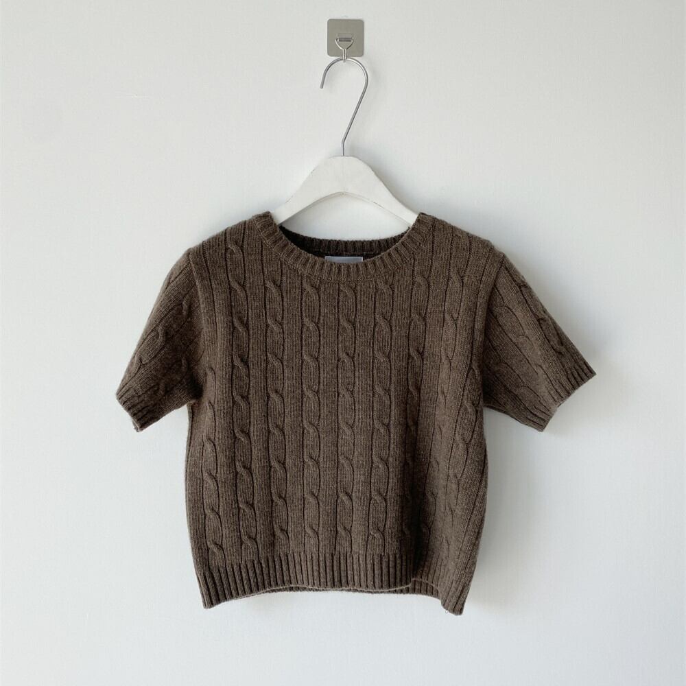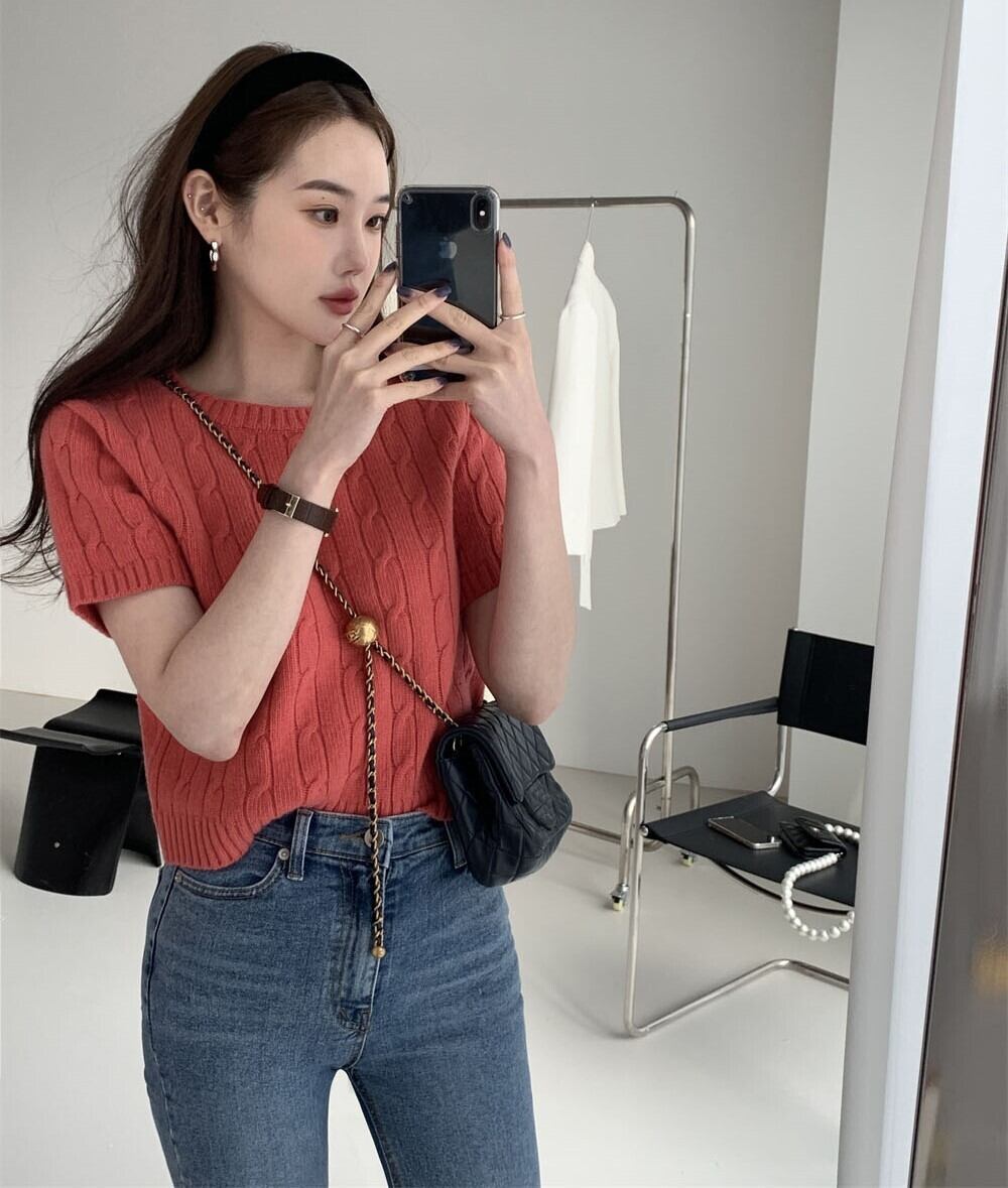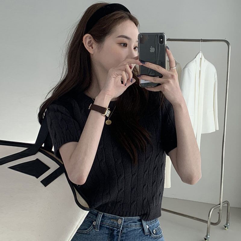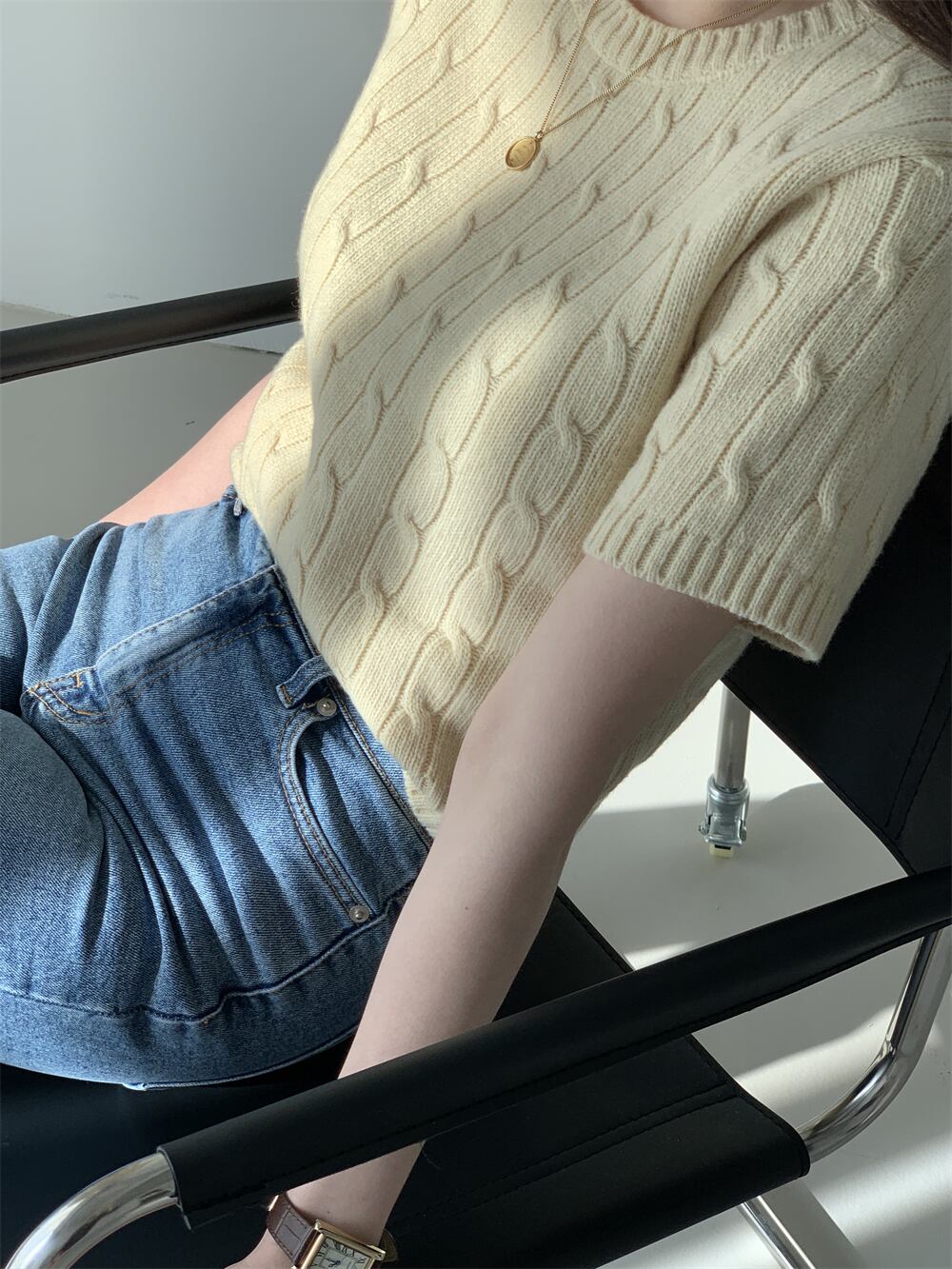 ケーブル編み クロップド トップス セーター サマーニット ショート丈 袖あり 半袖 襟なし クルーネック ニット 伸縮性 かわいい 大人可愛い シンプル カジュアル きれいめ おしゃれ お洒落 上品 大人女子 こなれ感 縄模様 春 夏 レディース 女性用 ママ 女の子 OL 通勤 学生 通学 デート お出かけ 女子会 普段使い 着回し 合わせやすい 韓国風 オルチャン ファッション コーデ スタイル 脚長見え フリーサイズ 黒 ブラック 茶色 ブラウン オレンジピンク クリームイエロー カラバリ