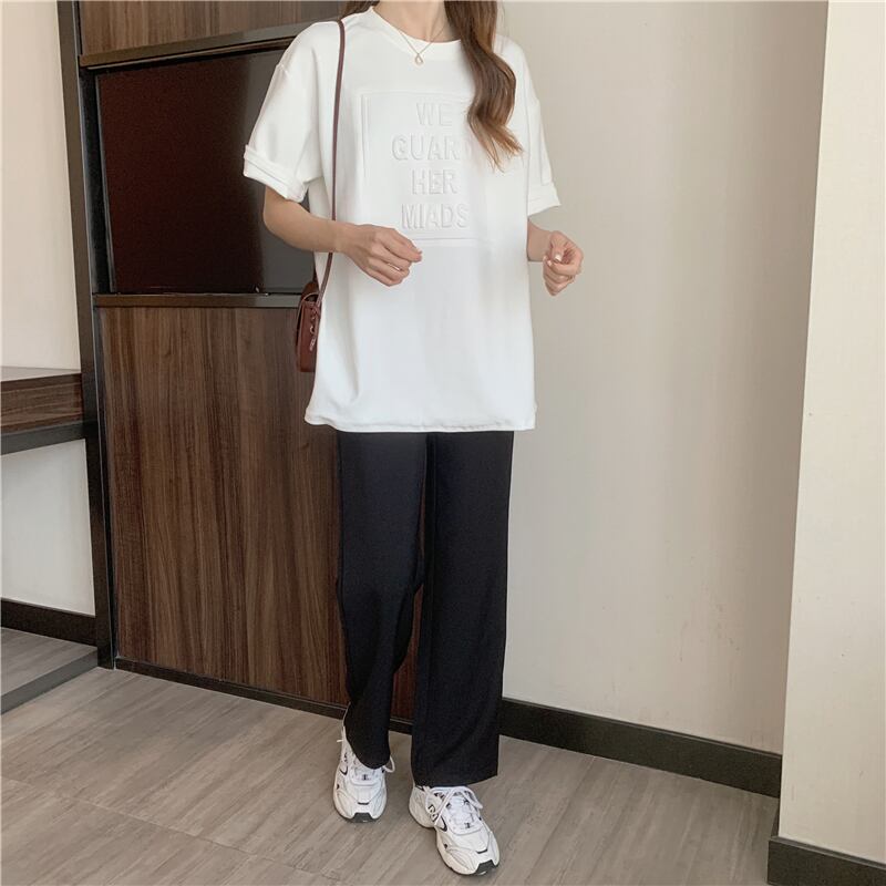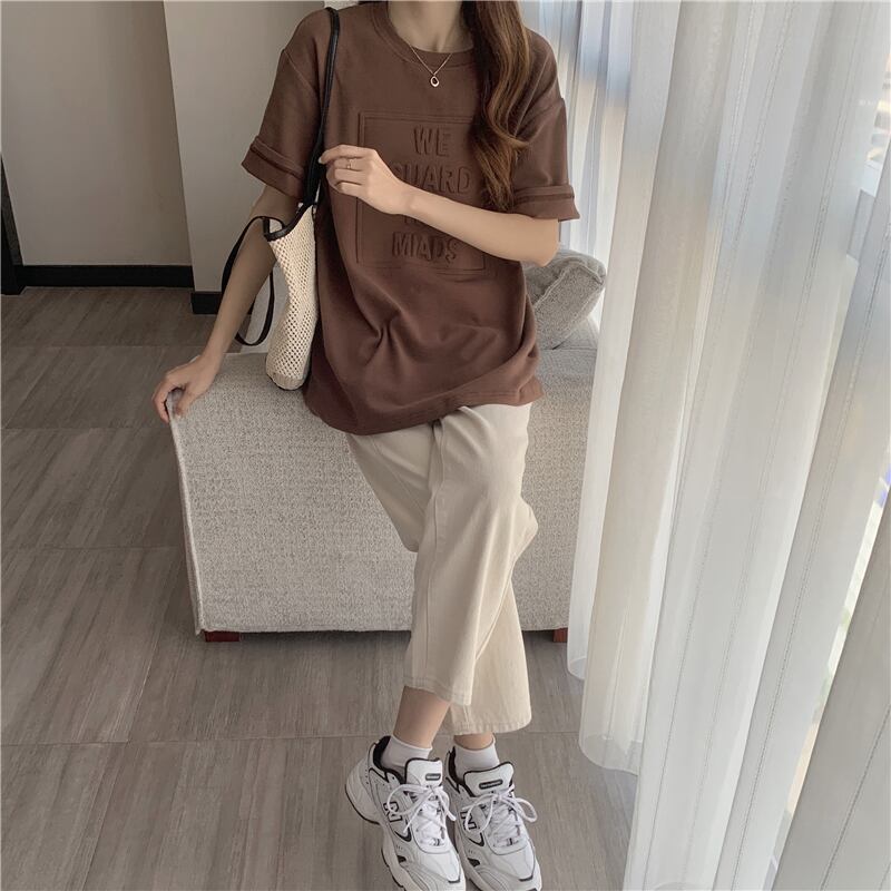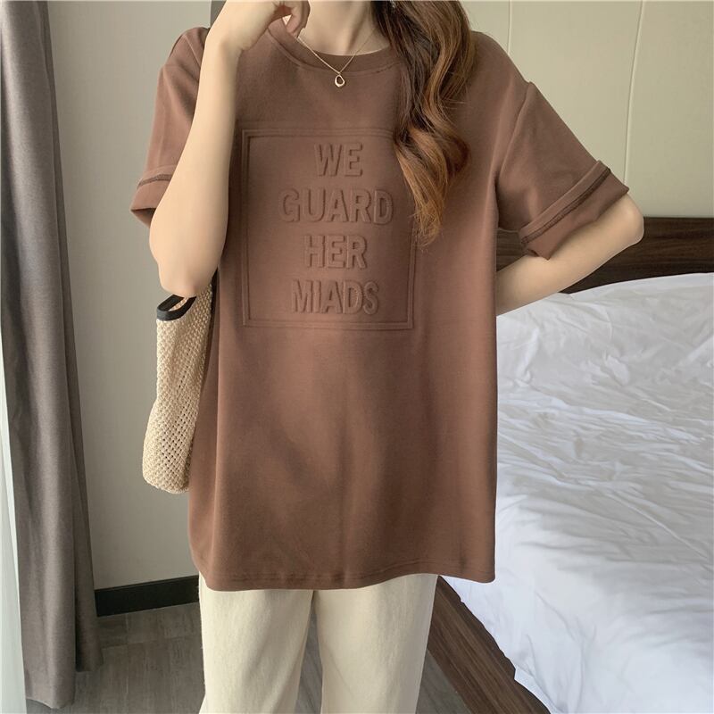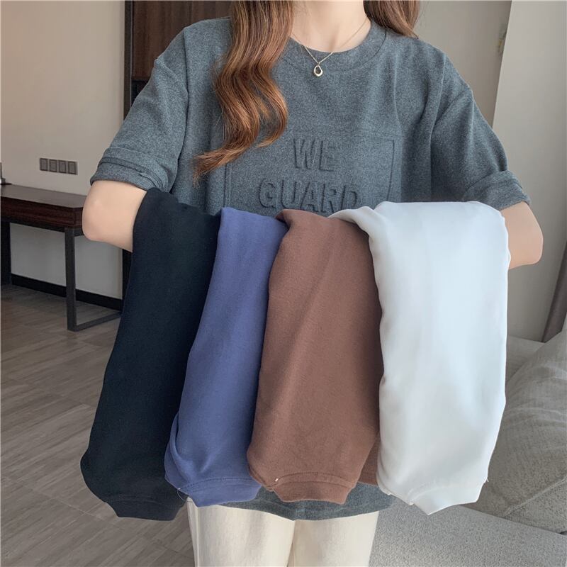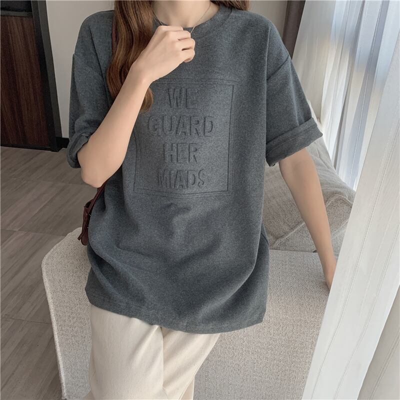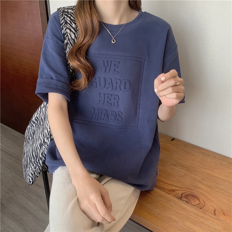 オーバーサイズ 胸エンボスロゴ トップス Tシャツ 白トップス ミディアム丈 チュニック丈 五分袖 ドロップショルダー 襟なし クルーネック シンプル カジュアル おしゃれ お洒落 大人女子 こなれ感 ボーイッシュ 無地 春 夏 レディース ママ 女の子 学生 通学 デート お出かけ 公園デビュー 普段使い 着回し 重ね着 韓国風 オルチャン ファッション コーデ スタイル 体系カバー M L XL 大きめ ゆったり サイズ 白 ホワイト 黒 ブラック 青 ブルー 灰色 グレー 茶色 ブラウン カラバリ