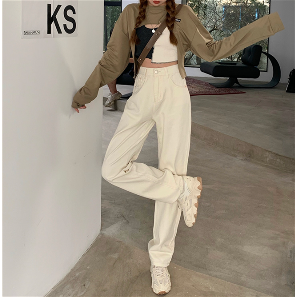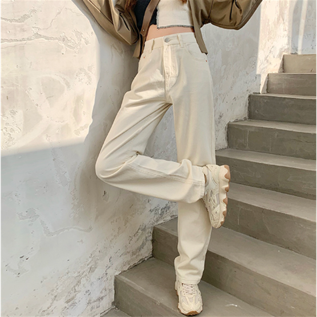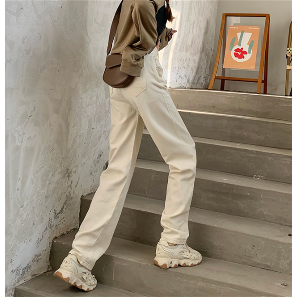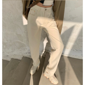 ハイウエストで形が美しい細見えストレートパンツ。オフホワイト(ベージュ)とブラックの2色展開です。普段着からくるぶしを折って着てもかわいいです。