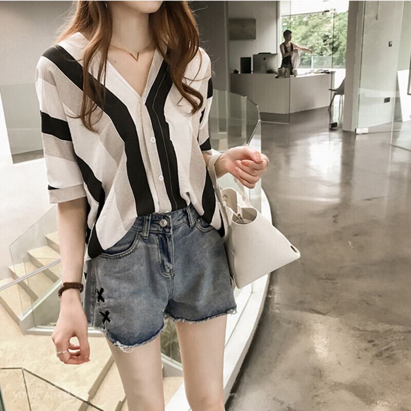 大胆に開いたVネックが涼しげなストライプシャツ。