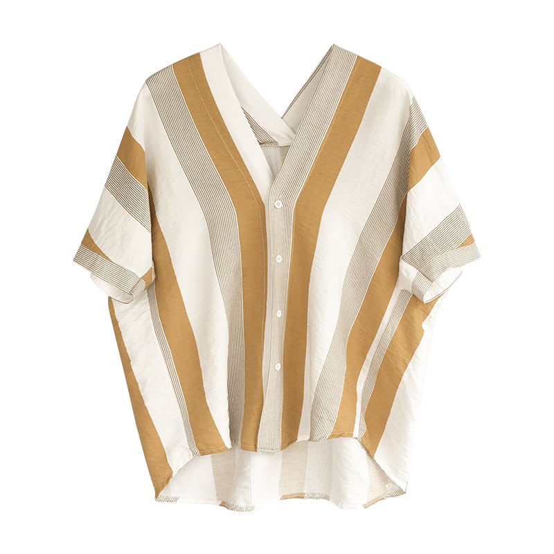 トップス シャツ ブラウス 袖あり 5分袖 ドルマンスリーブ Vネック 襟なし ワイド 前開き 透け感 前ボタン 大人可愛い カジュアル 大人 おしゃれ お洒落 大人可愛い 大人女子 こなれ感 ラフ 個性的 存在感 抜け感 ストライプ 春 夏 10代 20代 30代 40代 レディース 女性用 オフィス OL 通勤 学生 通学 デート お出かけ 女子会 お泊まり 休日 リゾート 旅行 海 着回し 普段使い 楽ちん 体系カバー サイズ M L XL 2XL 3XL 4XL ブラック イエロー