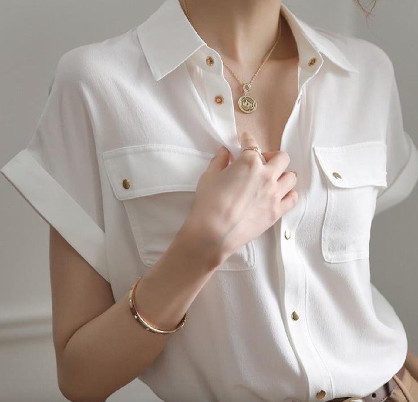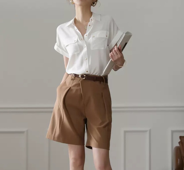 トップス シャツ ブラウス 白シャツ 白トップス 袖あり 半袖 襟付き シャツ襟 開襟 細身 シフォン ポケット 前開き 前ボタン きれいめ カジュアル 大人 上品 おしゃれ お洒落 かっこいい 大人女子 こなれ感 エレガント 存在感 とろみ感 抜け感 無地 春 夏 10代 20代 30代 40代 レディース 女性用 オフィス OL 通勤 学生 通学 デート お出かけ 女子会 お泊まり 休日 パーティー イベント 旅行 ホテル レストラン 着回し 普段使い S M L XL