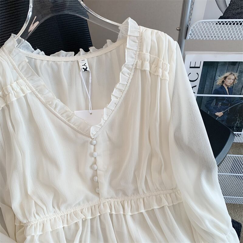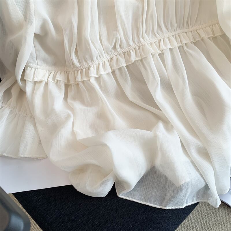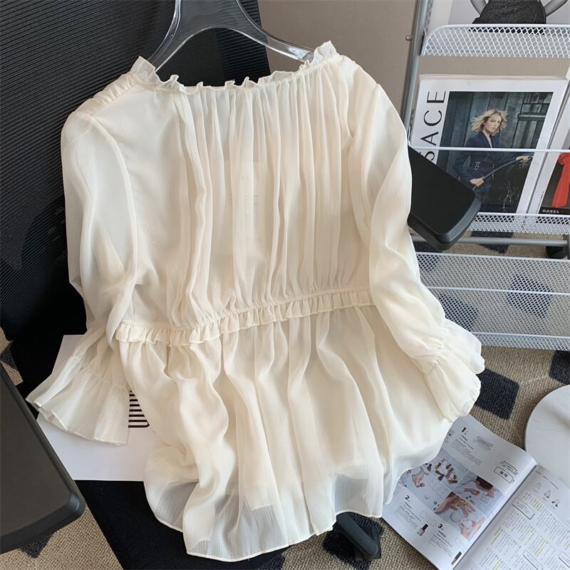 ウエストのフリルがアクセントになったシフォンブラウス。