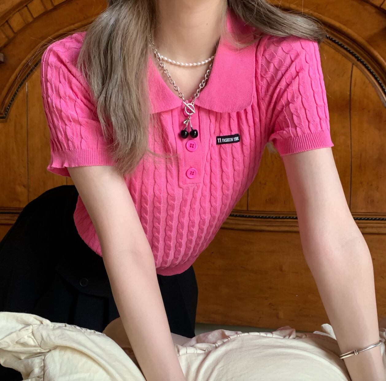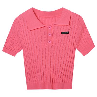 トップス ポロシャツ ショート丈 袖あり 半袖 襟付き シャツ襟 細身 編み込み 伸縮性 前ボタン 綿 ニット サマーニット かわいい 大人可愛い カジュアル 大人 おしゃれ お洒落 大人可愛い 大人女子 こなれ感 キュート 抜け感 無地 春 夏 10代 20代 30代 40代 レディース 女性用 学生 通学 デート お出かけ 女子会 お泊まり 休日 旅行 着回し 普段使い スタイル ワンサイズ ピンク アプリコット