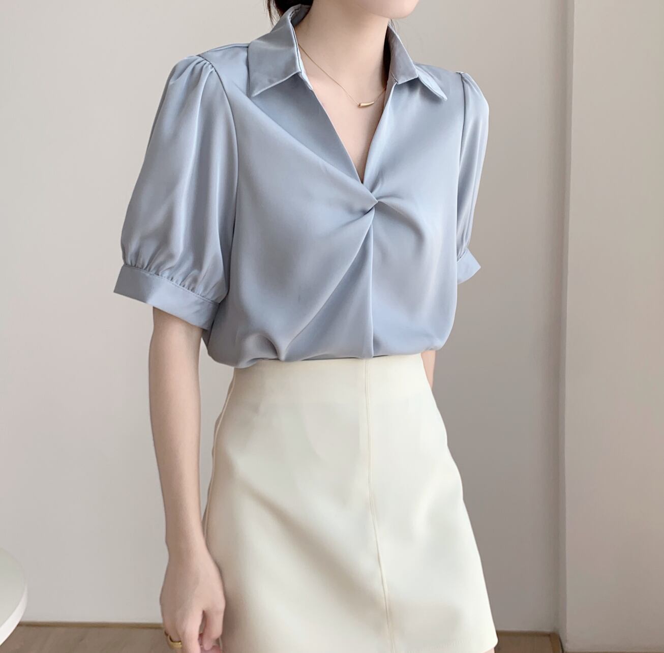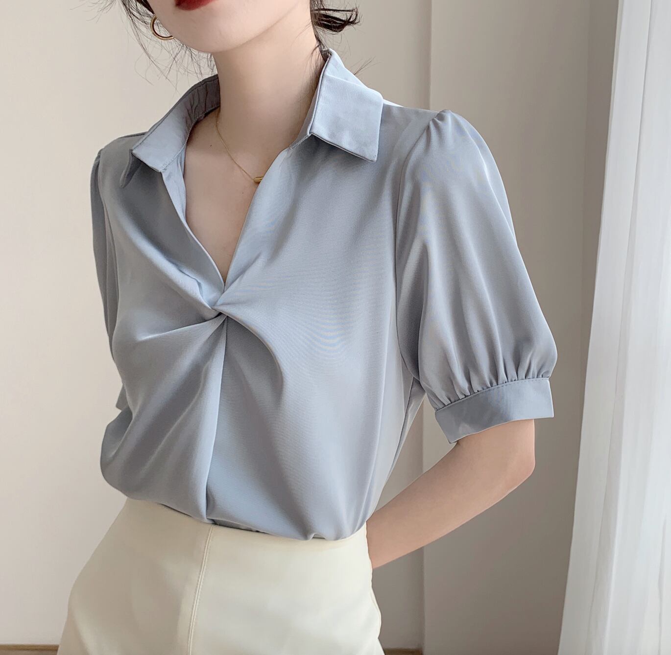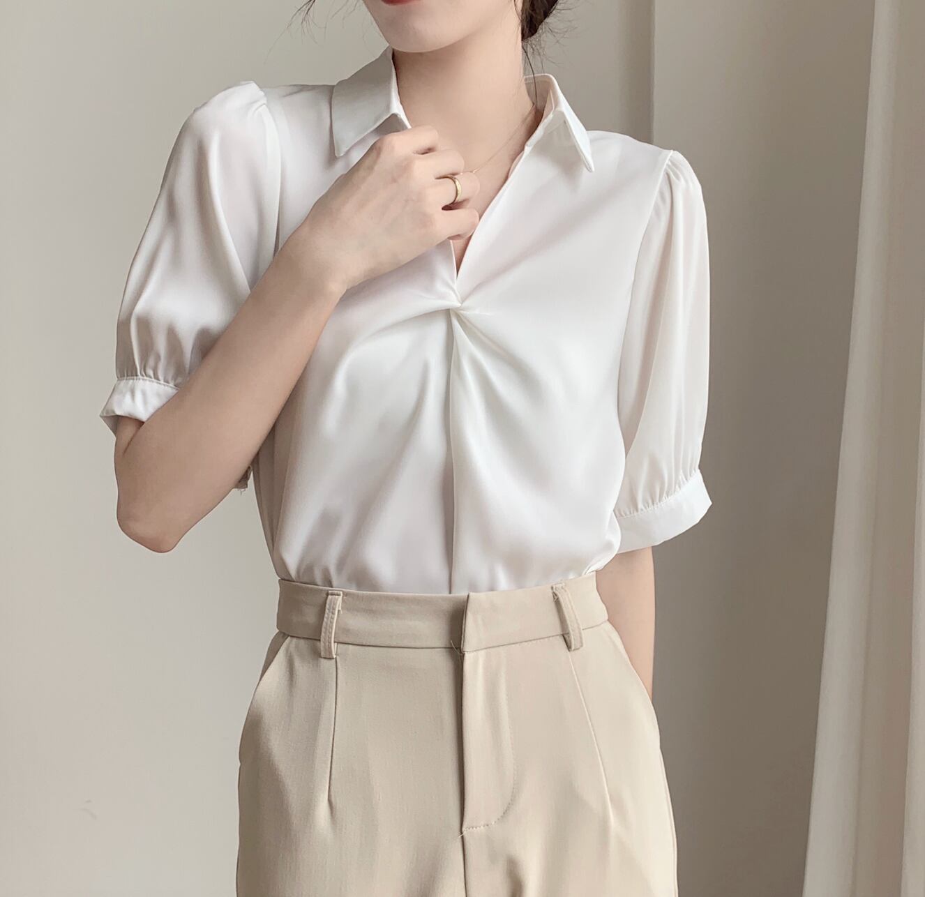 トップス シャツ ブラウス 白シャツ 白トップス 袖あり 半袖 5分袖 五分袖 パフスリーブ バルーンスリーブ ランタンスリーブ Vネック 襟付き シャツ襟 ストレート シフォン 大人可愛い きれいめ シンプル 大人 上品 おしゃれ お洒落 大人女子 こなれ感 エレガント とろみ感 抜け感 無地 春 夏 10代 20代 30代 40代 レディース 女性用 オフィス OL 通勤 学生 通学 デート お出かけ 女子会 休日 パーティー イベント ホテル レストラン 着回し 普段使い S M L XL 2XL