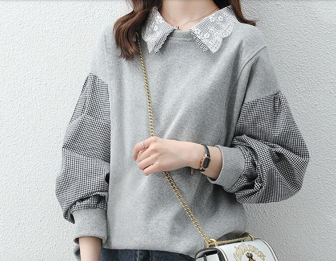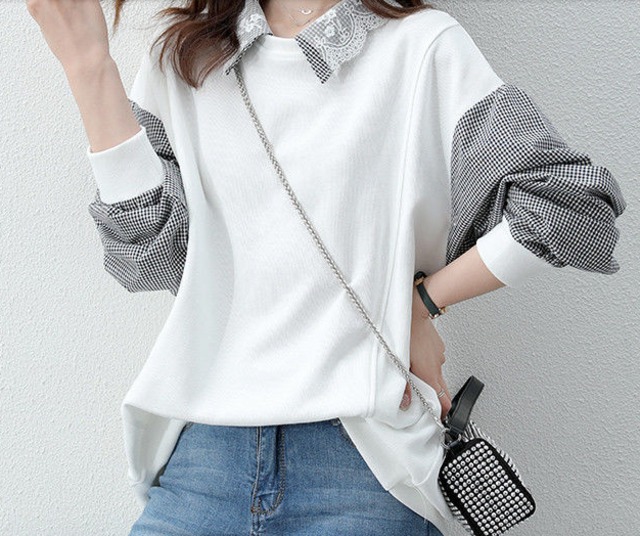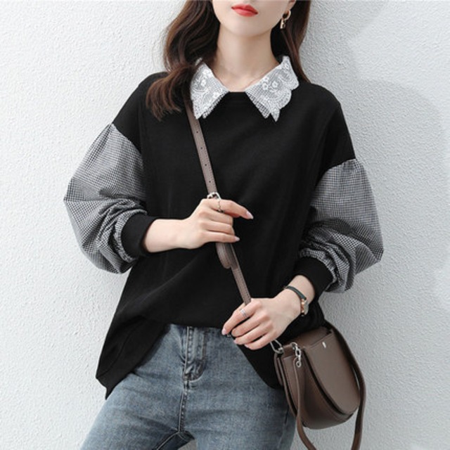 レースの襟元が可愛いフェイクツーピースで綺麗めな装いです