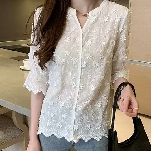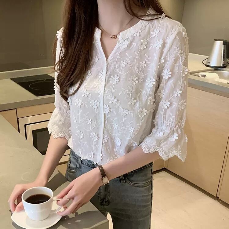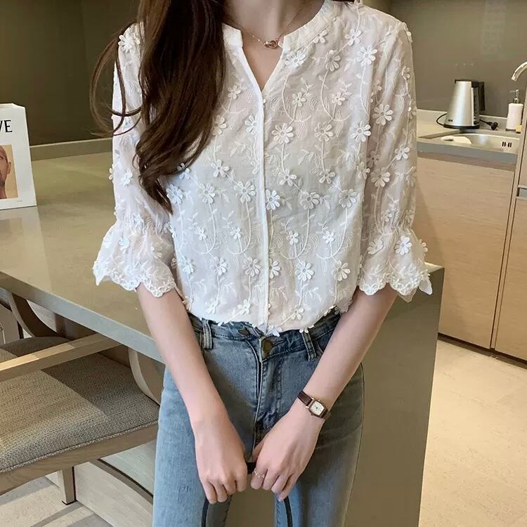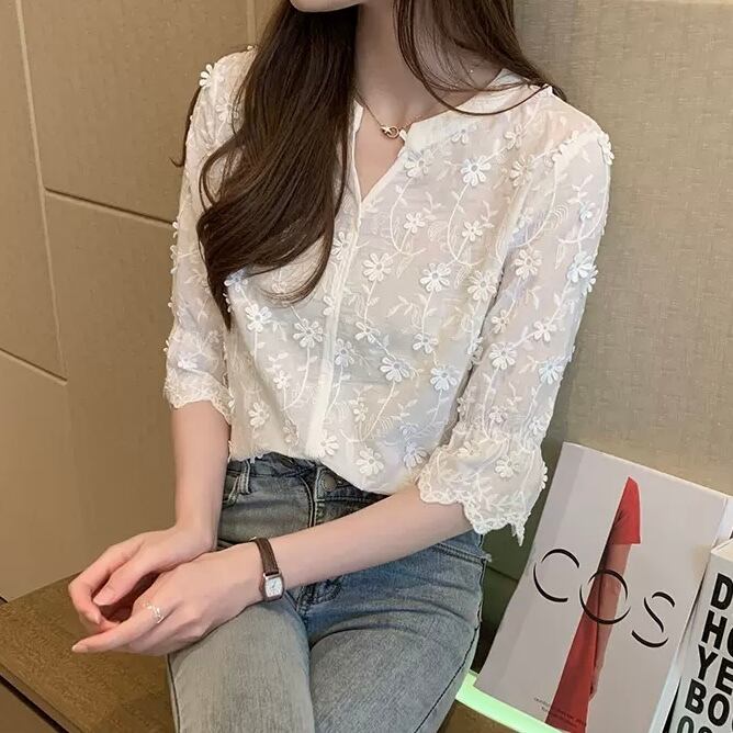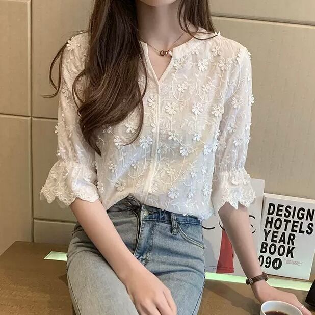 トップス ブラウス カットソー 白トップス 袖あり 5分袖 フレアスリーブ フレンチスリーブ Vネック ストレート レース 刺繍 透け感 薄手 かわいい 大人可愛い きれいめ シンプル カジュアル 大人 上品 おしゃれ お洒落 レトロ 大人女子 ガーリー セクシー モダン 抜け感 柄 花柄 小花柄 春 夏 秋 10代 20代 30代 40代 50代 レディース 学生 通学 デート お出かけ 公園デビュー 女子会 リゾート 旅行 ホテル ガーデン 着回し 普段使い 重ね着 韓国 韓国系 オルチャン