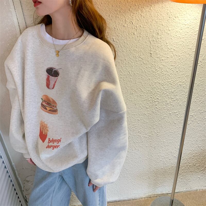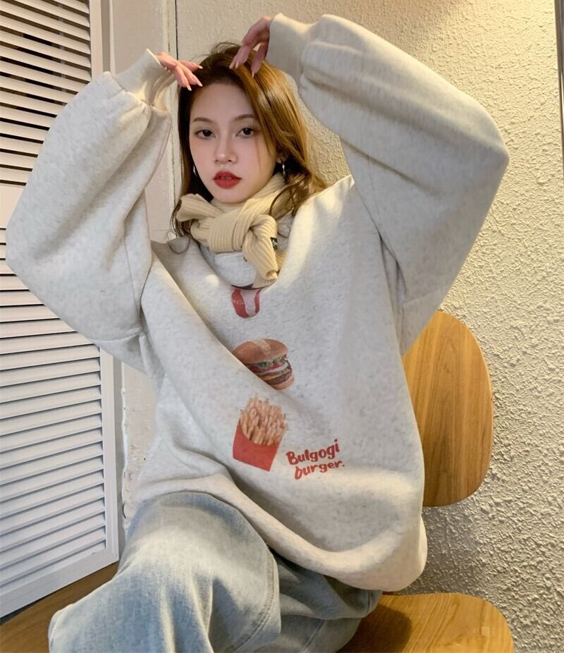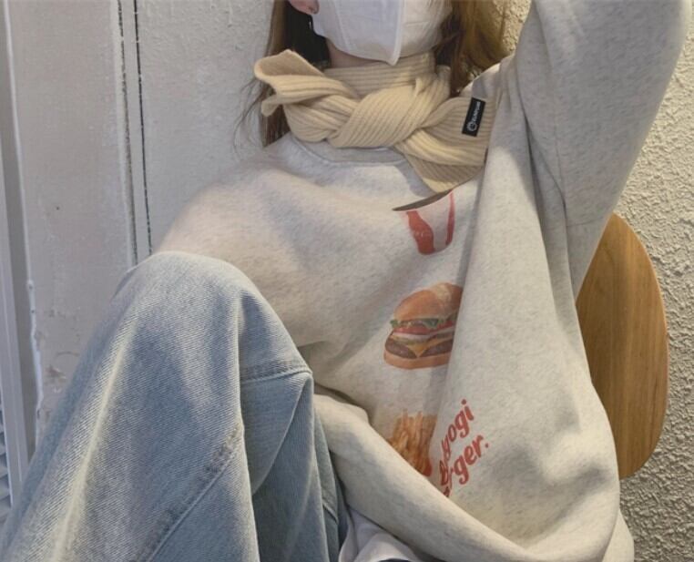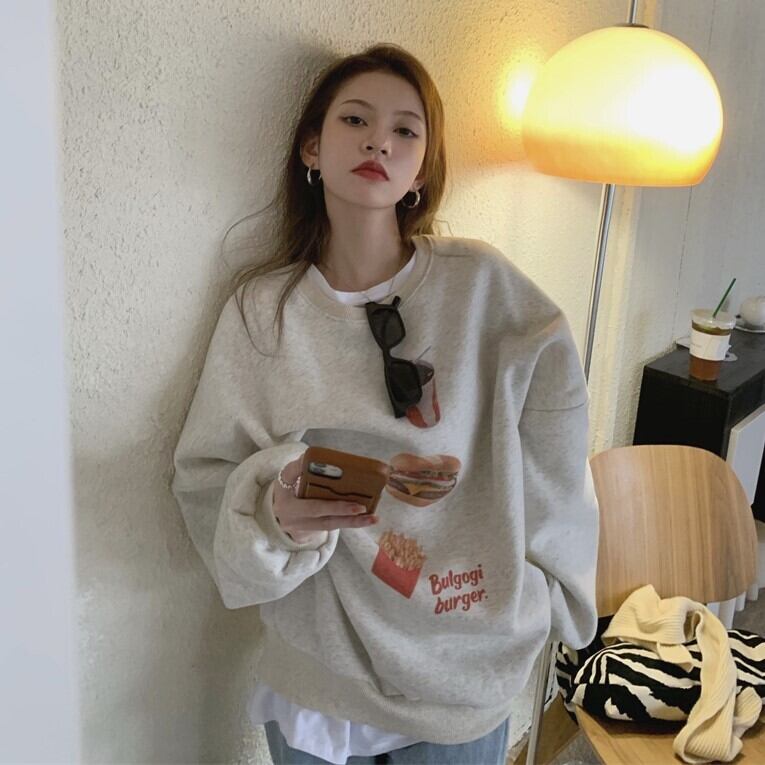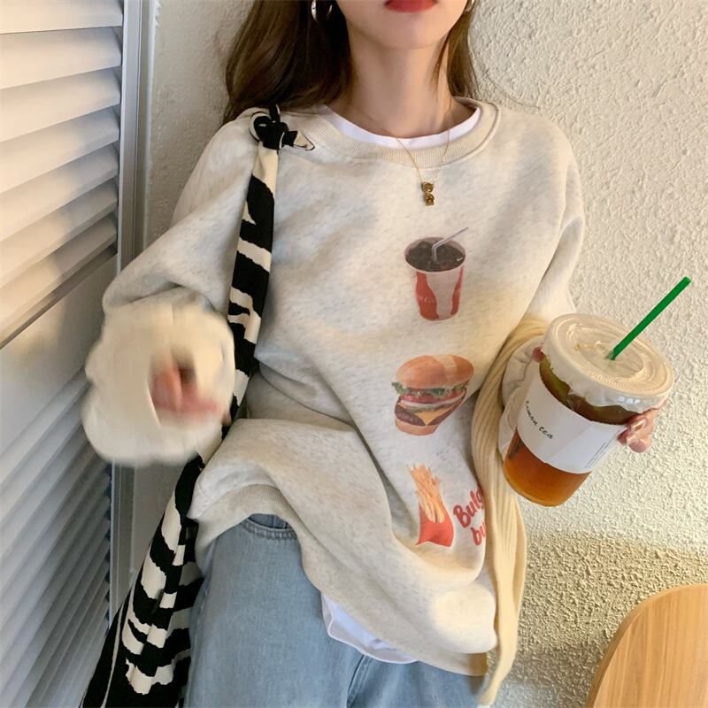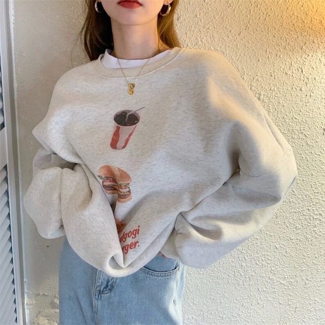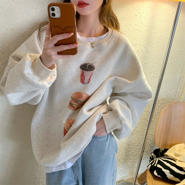 オーバーサイズ ハンバーガーセットプリント トップス スウェット トレーナー プルオーバー ミディアム丈 長袖 ランタンスリーブ ボリューム袖 ドロップショルダー 襟なし ラウンドネック シンプル カジュアル 大人女子 上品 おしゃれ こなれ感 存在感 個性的 インパクト プリント柄 春 秋 冬 レディース ママ 女の子 学生 通学 デート お出かけ 女子会 休日 普段使い 重ね着 韓国風 オルチャン ファッション スタイル 体系カバー S M L XL XXL 大きいサイズ ゆったり ゆる サイズ