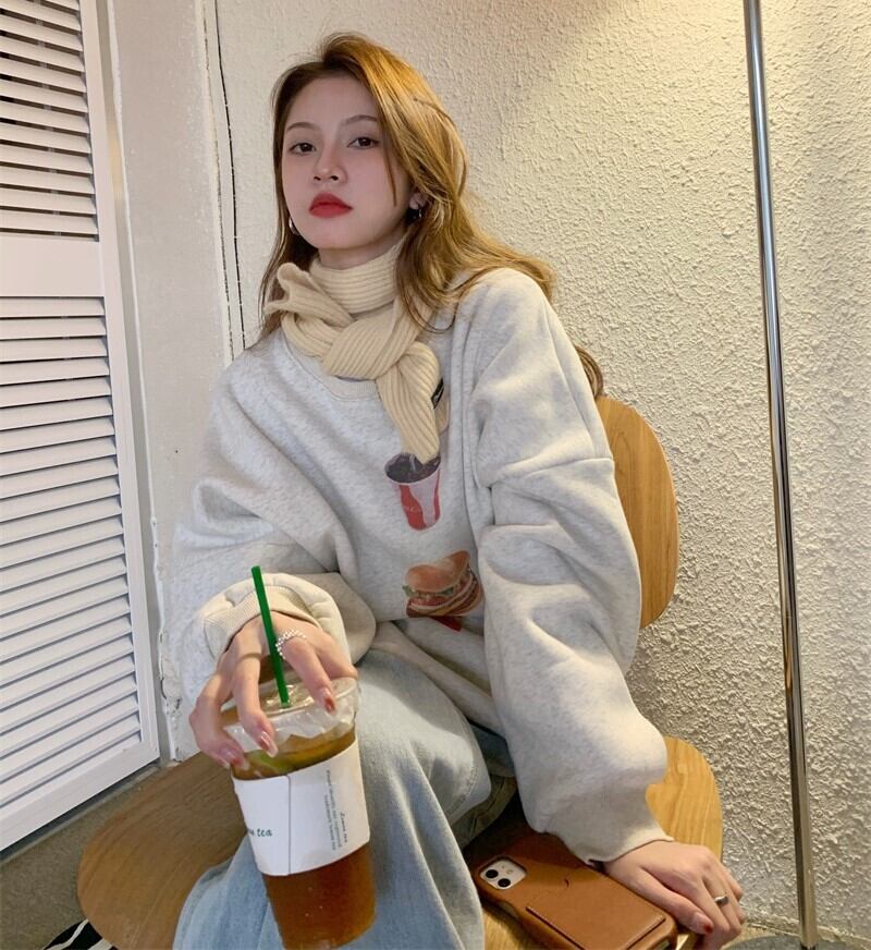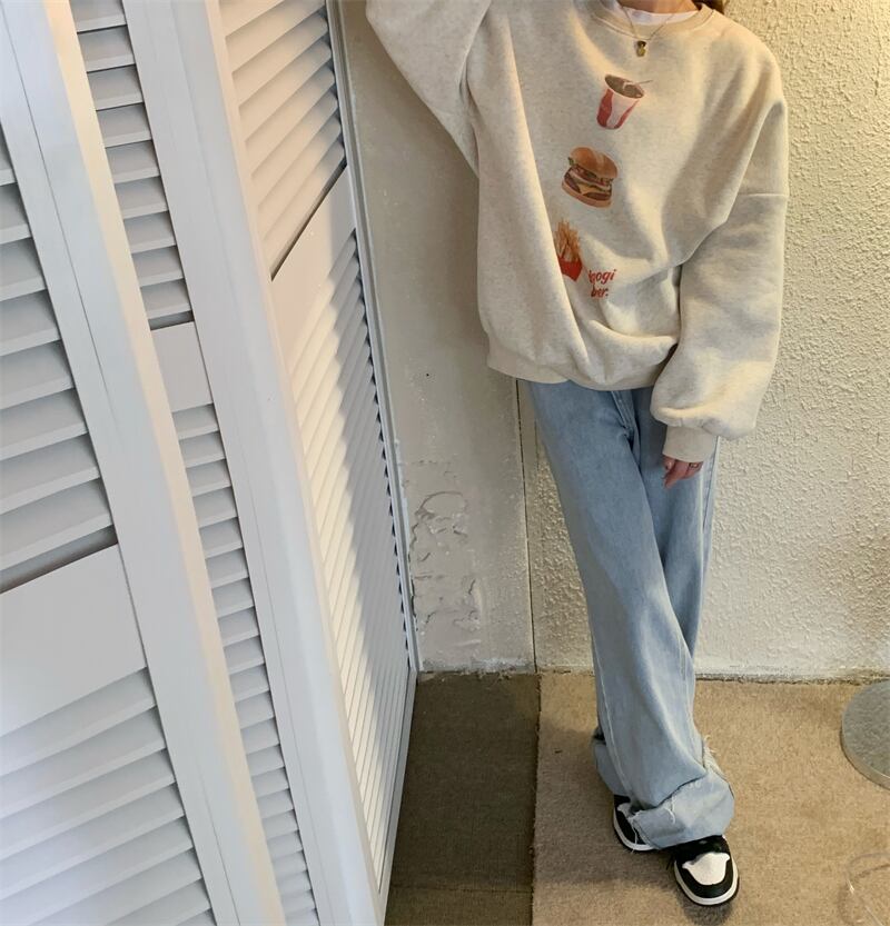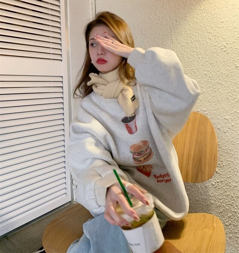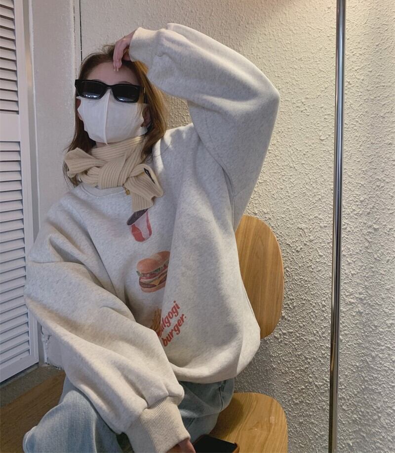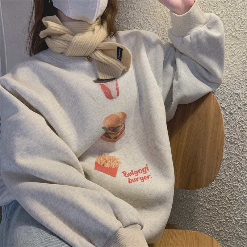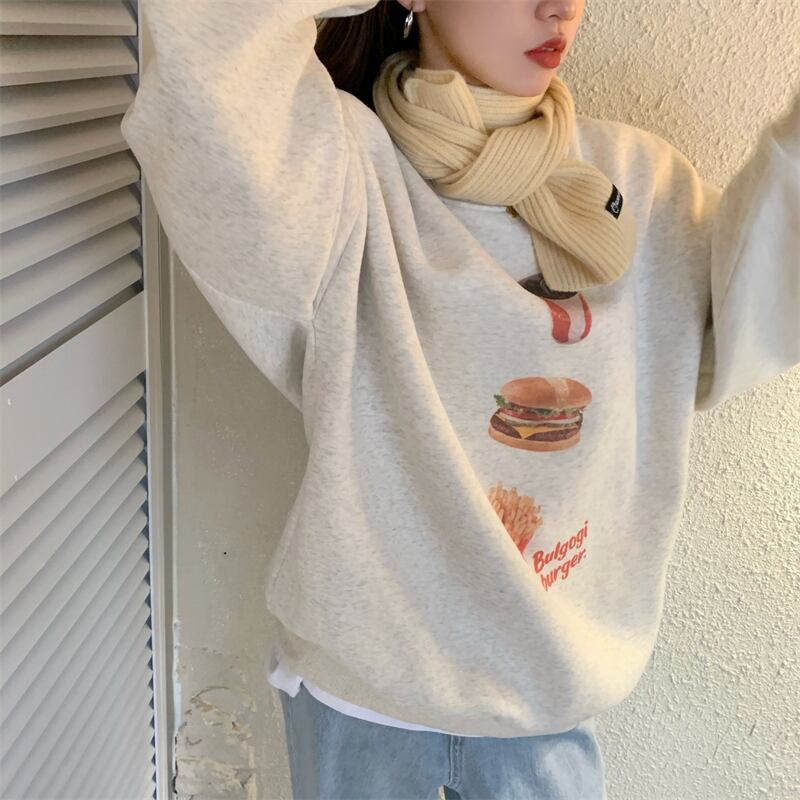 オーバーサイズ ハンバーガーセットプリント トップス スウェット トレーナー プルオーバー ミディアム丈 長袖 ランタンスリーブ ボリューム袖 ドロップショルダー 襟なし ラウンドネック シンプル カジュアル 大人女子 上品 おしゃれ こなれ感 存在感 個性的 インパクト プリント柄 春 秋 冬 レディース ママ 女の子 学生 通学 デート お出かけ 女子会 休日 普段使い 重ね着 韓国風 オルチャン ファッション スタイル 体系カバー S M L XL XXL 大きいサイズ ゆったり ゆる サイズ
