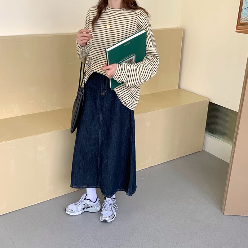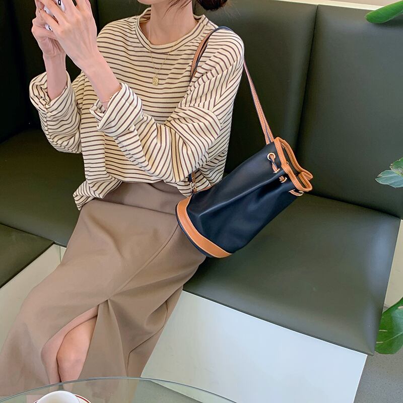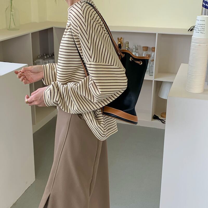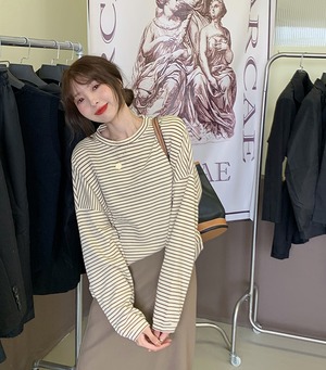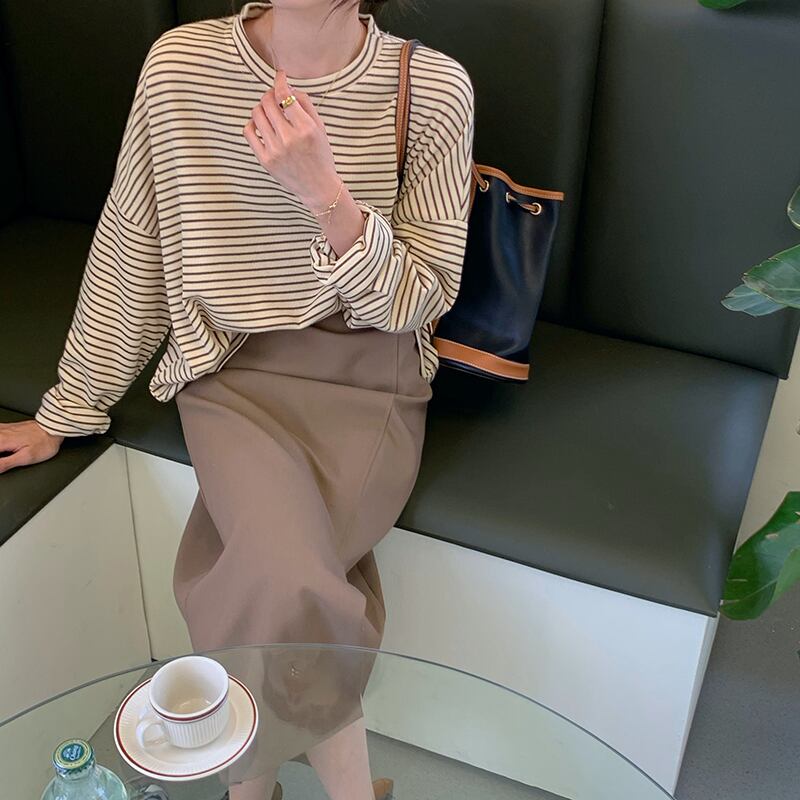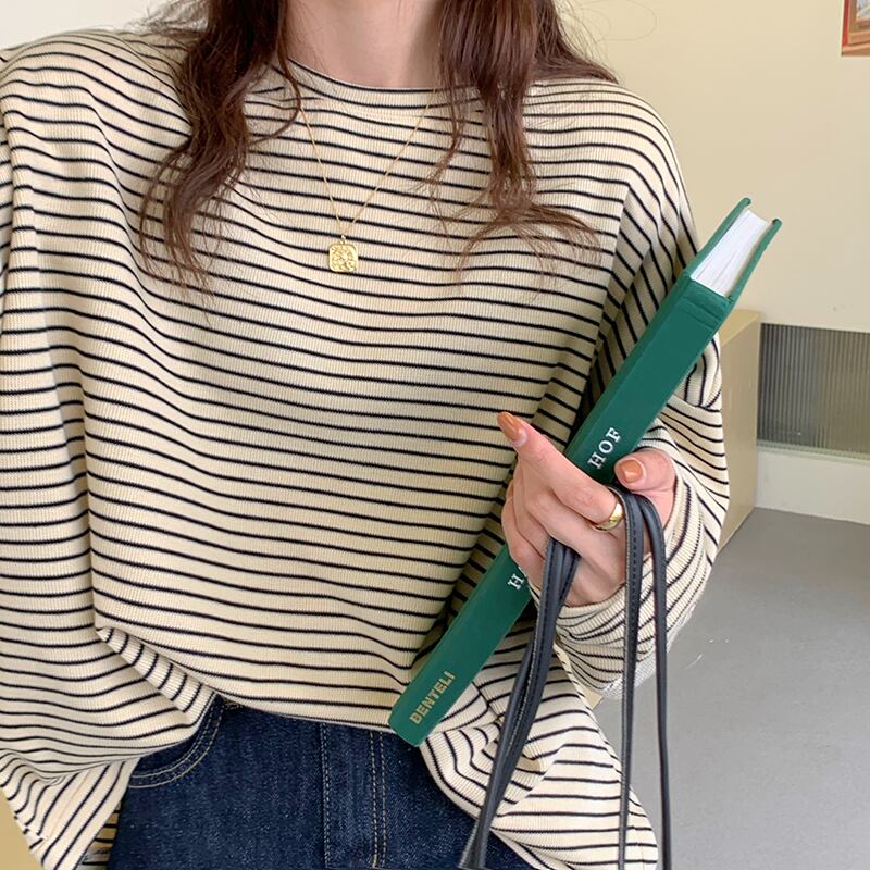 トップス カットソー 袖あり 長袖 ドロップショルダー ラウンドネック 襟なし ストレート ワイド 伸縮性 かわいい 大人可愛い カジュアル おしゃれ お洒落 かっこいい レトロ 大人可愛い こなれ感 ラフ 主役級 存在感 ボーダー 春 秋 10代 20代 30代 レディース 女性用 学生 通学 デート お出かけ 女子会 お泊まり 休日 アウトドア 旅行 着回し 普段使い 韓国系 楽ちん M L XL 2XL ゆったり ゆる 黒 ブラック 茶色 ブラウン