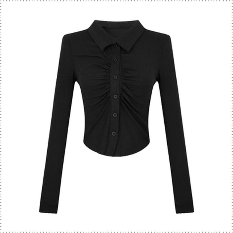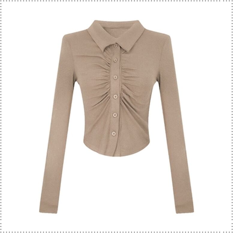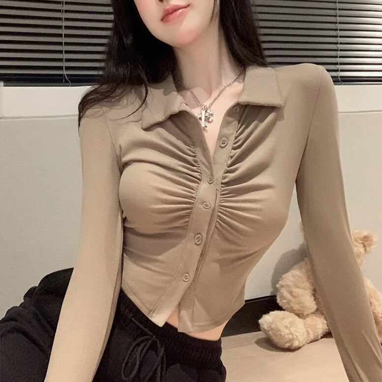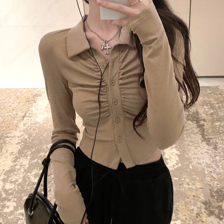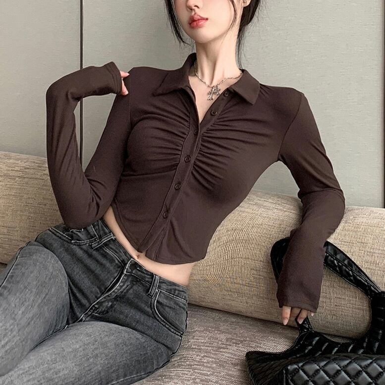 シャツ トップス クロップドシャツ レディース ショート丈シャツ クロップド丈 襟付き 長袖 ギャザー タイト カットソー 無地 茶色 黒 ブラウン カーキ ブラック 抜け感 オシャレ シンプル 可愛い キレイめ 上品 フェミニン マニッシュ カジュアル 春 夏 秋 冬 シーズンレス デイリー おでかけ アウトドア 普段着 ミニマム スマート コンパクト 細見え スタイルアップ 高見え 新鮮 上級者 主役級 鮮度アップ トレンド 動きやすい 軽やか ゆったり 体型カバー インスタ映え クール