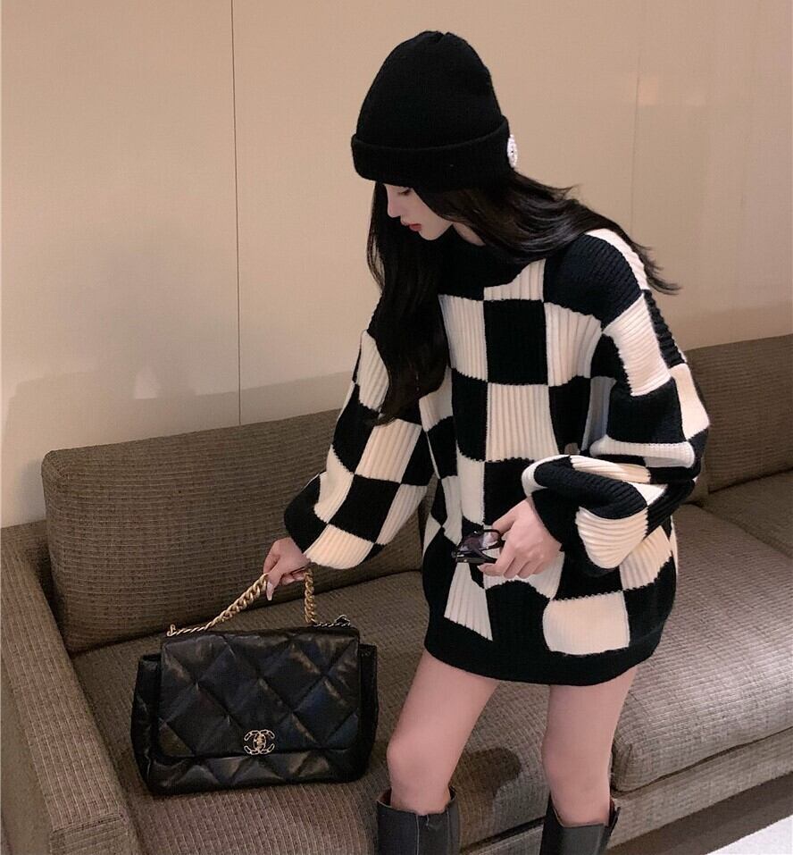 ぽわん袖 オーバーサイズ チェッカーフラッグ柄 インパクト トップス セーター プルオーバー ミディアム丈 チュニック丈 長袖 ドロップショルダー ランタンスリーブ ボリューム袖 襟なし クルーネック ニット シンプル カジュアル 大人っぽい おしゃれ こなれ感 存在感 個性的 市松模様 格子柄 秋 冬 レディース 女性用 ママ 女の子 学生 通学 デート お出かけ 女子会 休日 普段使い 重ね着 韓国風 オルチャン ファッション 体系カバー S M L XL 大きめ ゆったり ゆる サイズ モノトーン