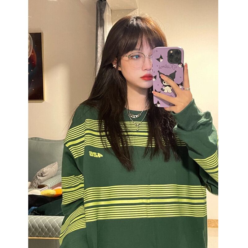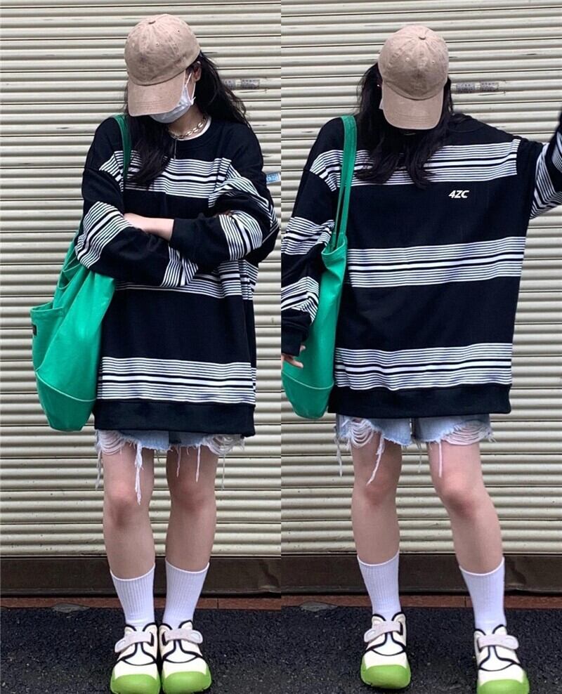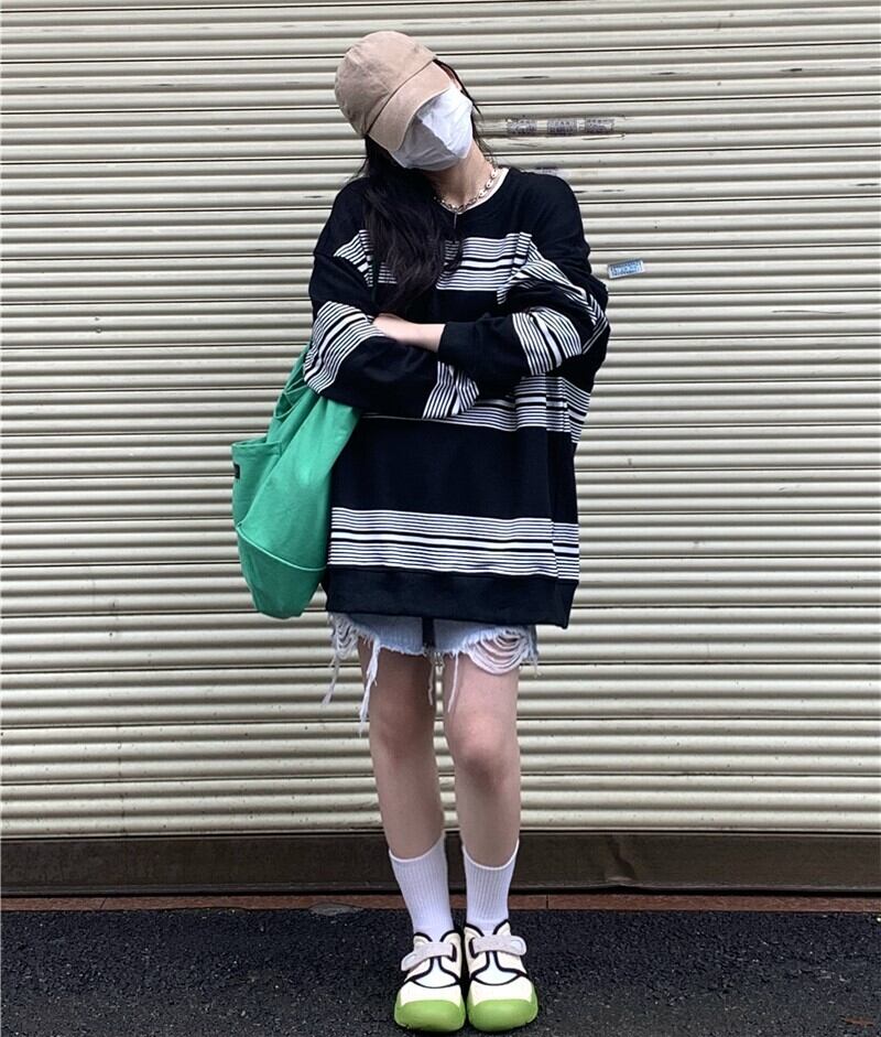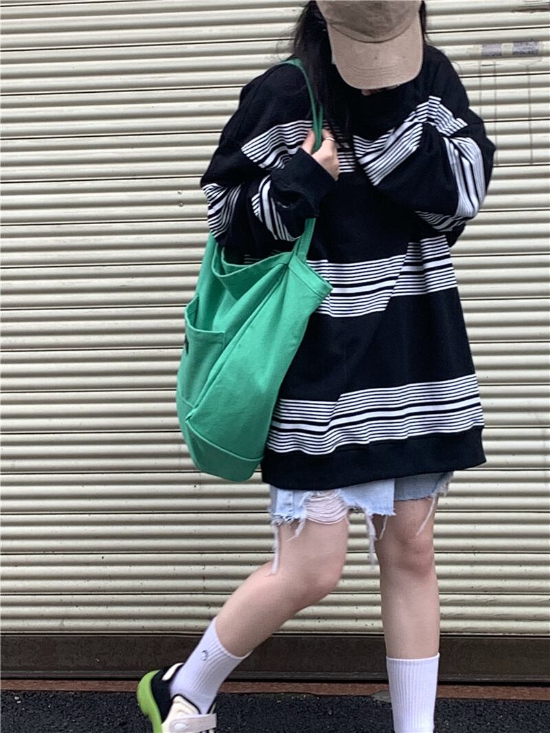 オーバーサイズ ランダムボーダー柄 ロゴプリント ゆるめ トップス スウェット トレーナー プルオーバー ミディアム丈 チュニック丈 長袖 ドロップショルダー 襟なし クルーネック 薄手 シンプル カジュアル 大人女子 おしゃれ お洒落 こなれ感 かっこいい ボーイッシュ ストリート ボーダー柄 シマ 横縞 春 秋 レディース ママ 女の子 学生 通学 お出かけ 休日 公園デビュー 普段使い 重ね着 韓国風 オルチャン コーデ S M L XL 2XL 大きいサイズ ゆったり 黒 ブラック 緑 グリーン