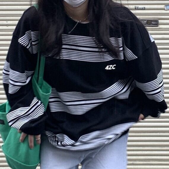 胸に控えめなロゴプリントが入ったランダムボーダー柄のスウェット。