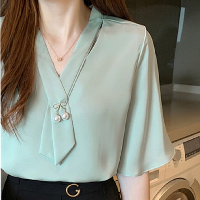 Vネックにリボンを足して大人可愛くて女性らしいレディースシャツ