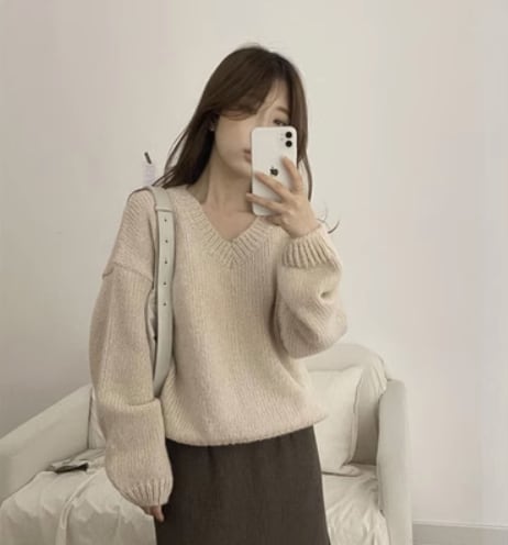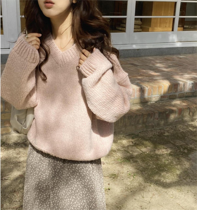 ざっくりとした編み地ガカジュアルな印象のVネックニット。