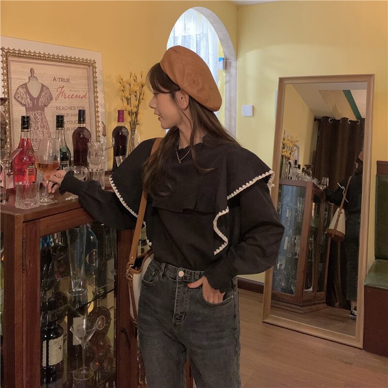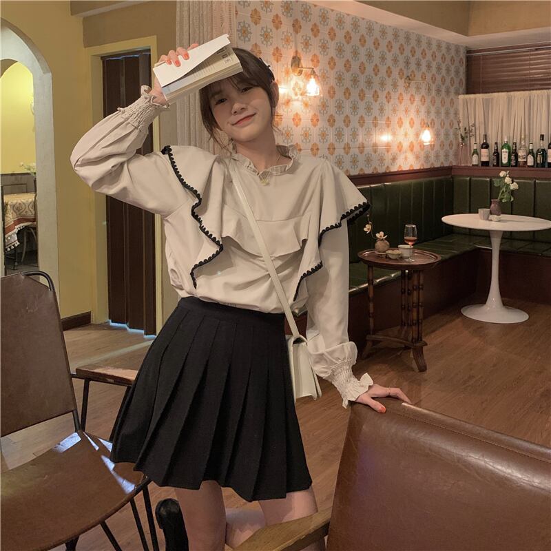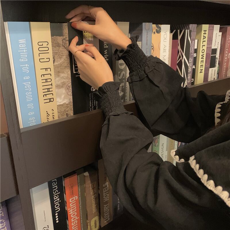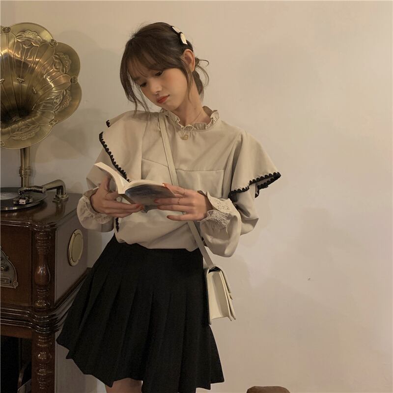 オーバーサイズ 配色刺しゅうトリミング フリルポイント トップス ブラウス ミディアム丈 長袖 手元シャーリング ボリューム袖 パフスリーブ 襟付き スタンドカラー フリルネック 刺繍 かわいい 大人可愛い シンプル カジュアル きれいめ 上品 大人 おしゃれ お洒落 ガーリー キュート フェミニン 甘め 無地 春 秋 レディース ママ 女の子 学生 通学 デート お出かけ 休日 普段使い 韓国風 オルチャン ファッション スタイル 体系カバー フリーサイズ ゆったり 黒 ブラック ベージュ カラバリ