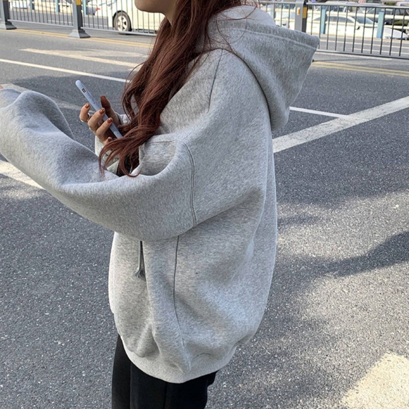 カジュアルで暖かいグレーの長袖フーディーです
