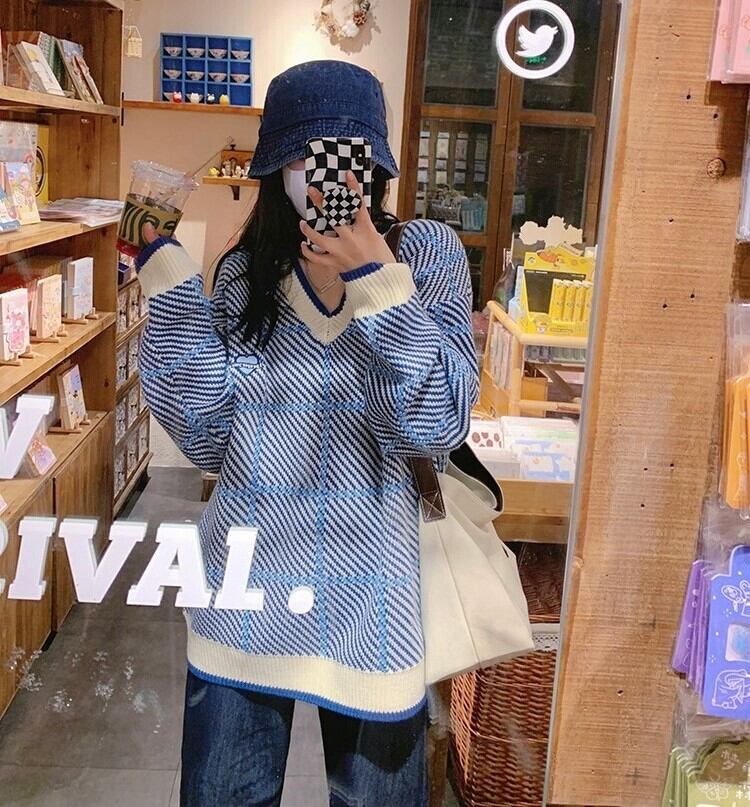 斜めストライプ柄に格子柄を重ねた模様がおしゃれなゆったりめのVネックニット。