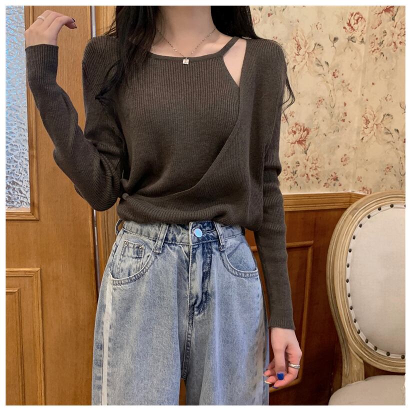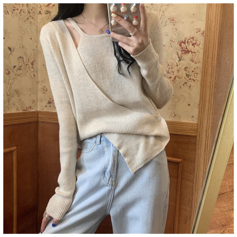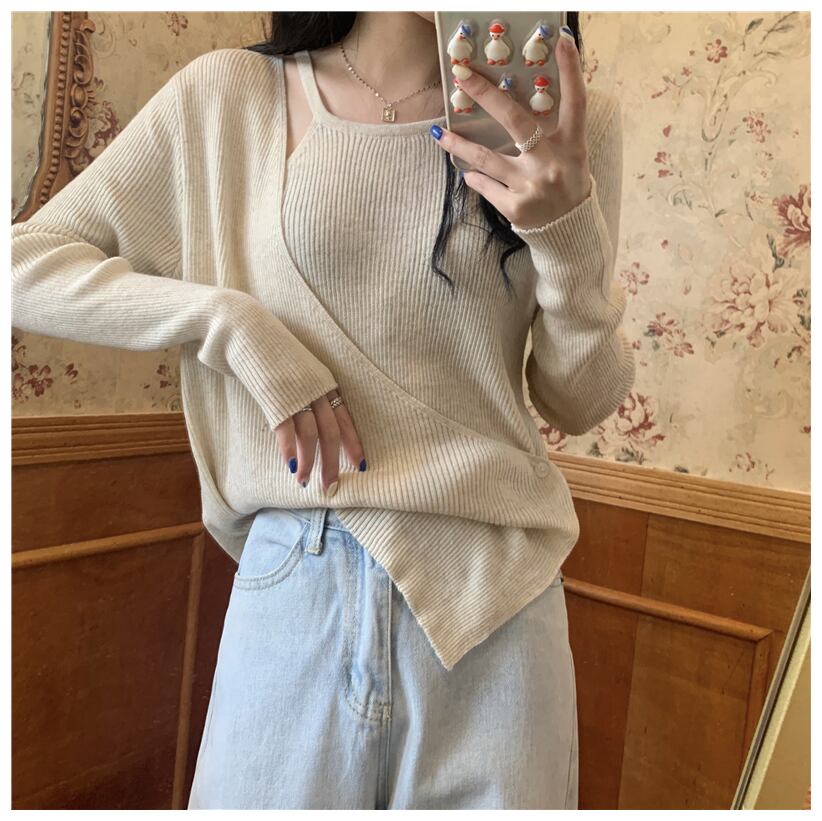 一見キャミソールとカーディガンを着ているように見えるドッキングデザインのリブニットソー。