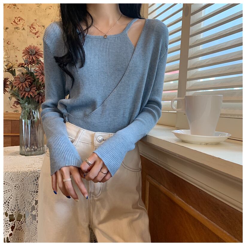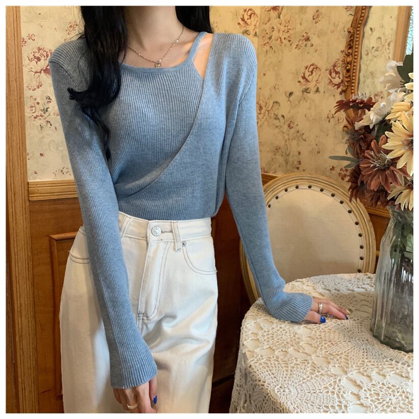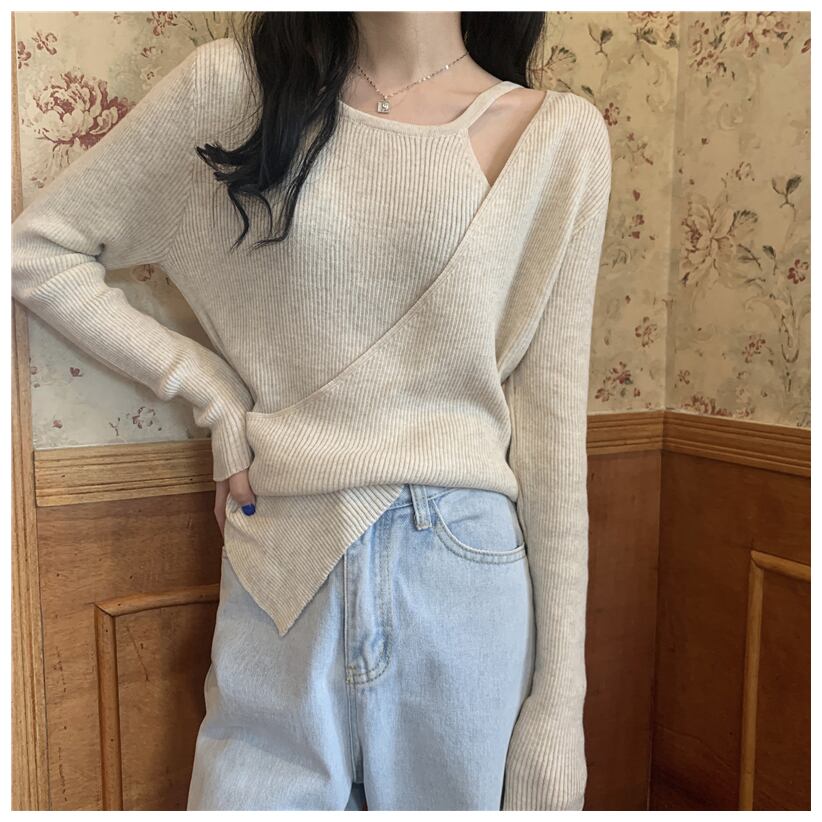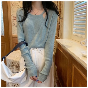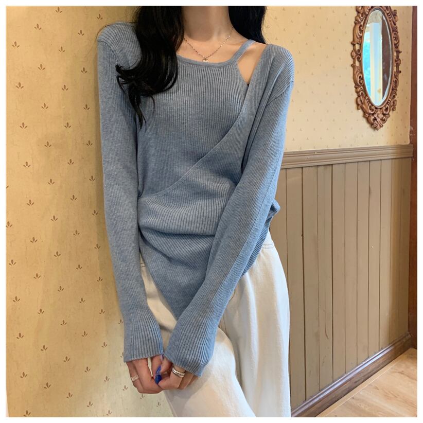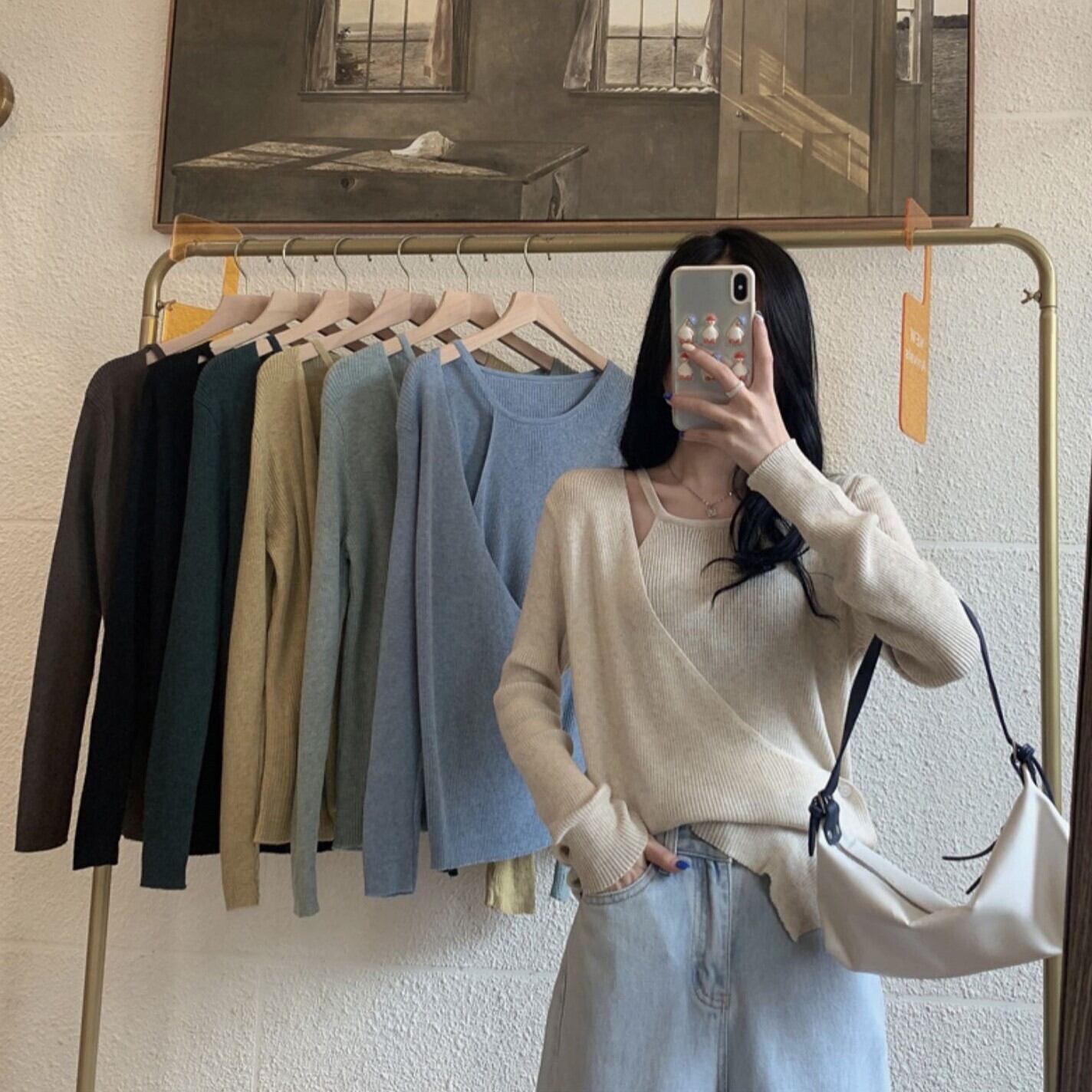 フェイクレイヤード 片側カットアウト アシンメトリーデザイン トップス ニットソー ミディアム丈 長袖 スリム スマート すっきり 伸縮性 リブ シンプル カジュアル おしゃれ お洒落 セクシー 大人っぽい かっこいい クール 個性的 存在感 スタイリッシュ 女っぽ 学生 通学 デート お出かけ 女子会 普段使い 重ね着風 合わせやすい 韓国風 韓国っぽ オルチャン ファッション コーデ スタイル S M L XL 黒 ブラック 青 ブルー 灰色 ダークグレー 緑 ビーンズグリーン ベージュ カラバリ